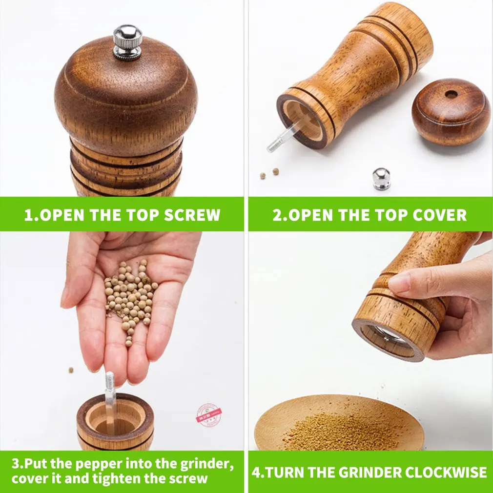 3. Эффективное шлифование: деревянная ручка чрезвычайно эффективна. Шлифовальная машина для перца дуба полностью регулируется. Открутите крышку, вставьте специи и закройте крышку. (Затягивание означает грубое, ослабление означает хорошее)