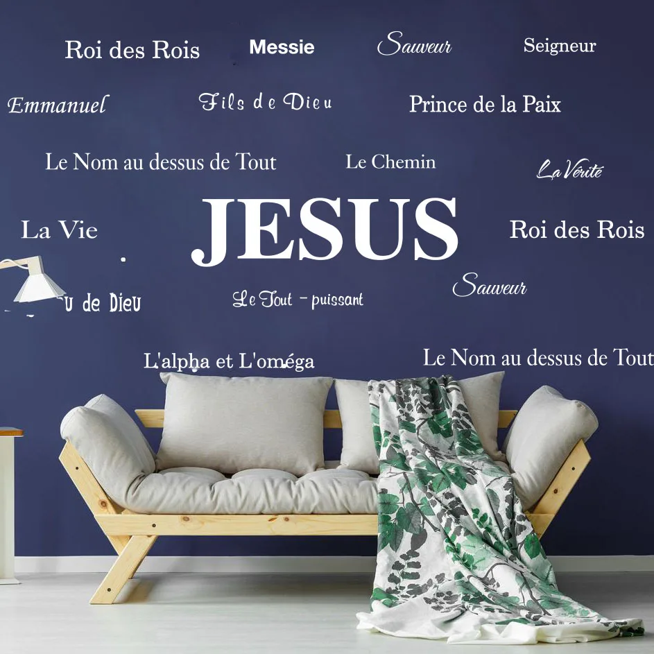 Французский имя Иисуса Бог Мессию лорд стены Стикеры Спальня Гостиная Библии и изображением Иисуса Христа Религия надписи Термоаппликации для кухни на стену винил деко