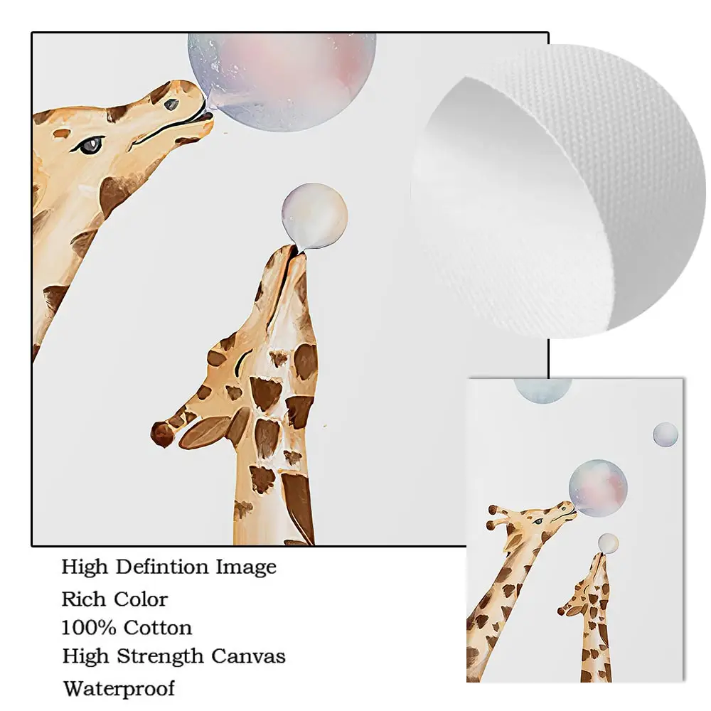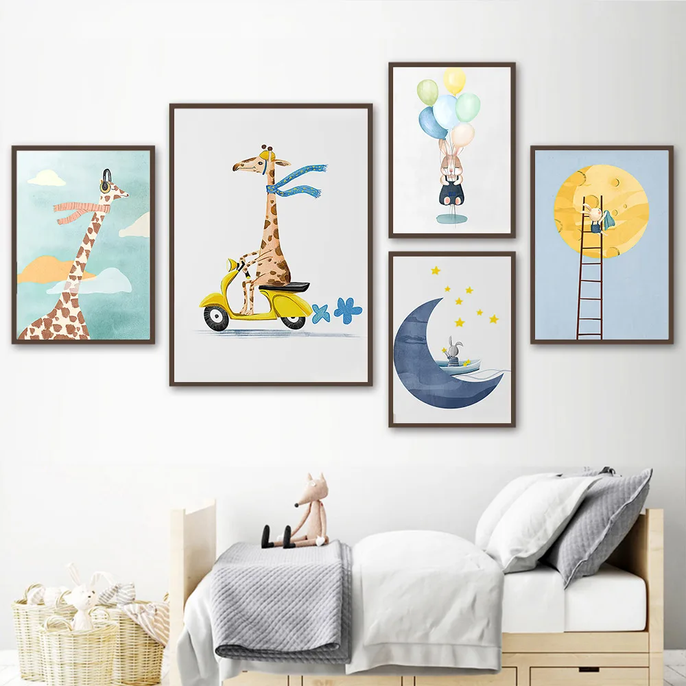 Постер на холсте с изображением жирафа, пузыря, кролика, воздушного шара, Луны, звезды, лестницы, декор детской комнаты