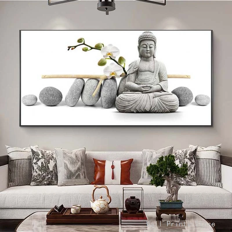 Плакаты и принты из камня с изображением белых цветов орхидеи, статуи Будды, Картина на холсте, элегантная настенная живопись, декор для гостиной, спальни, дома