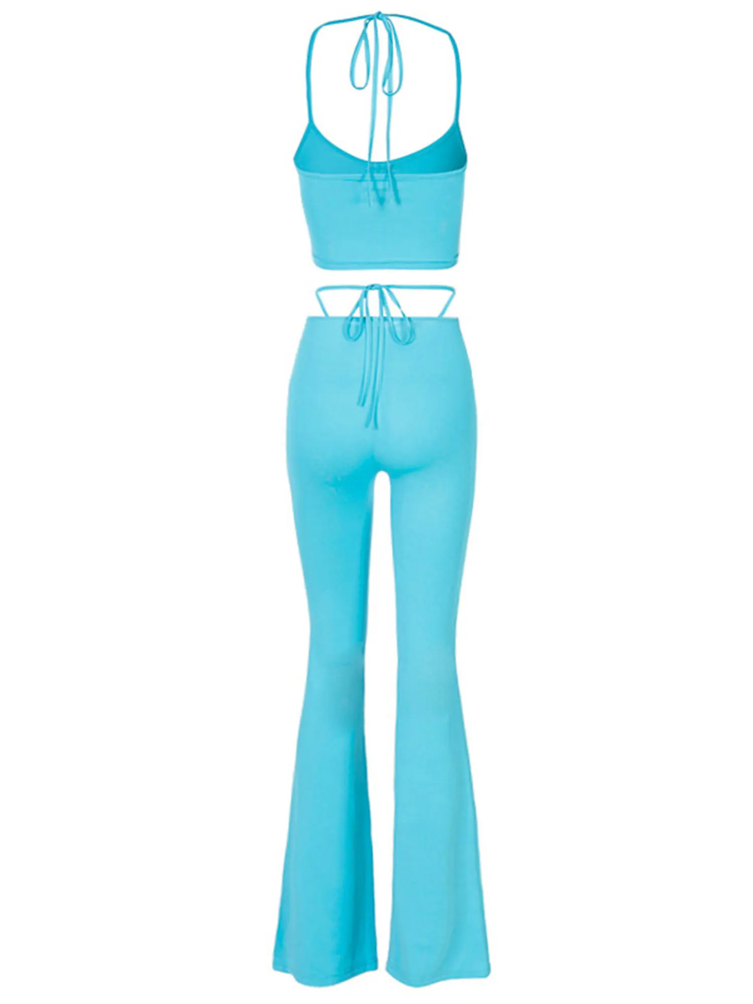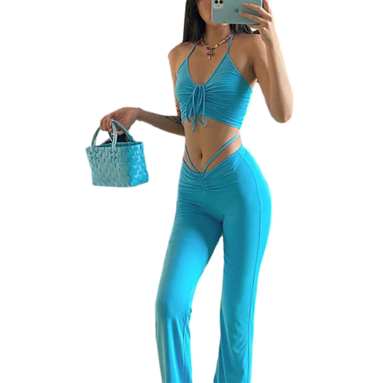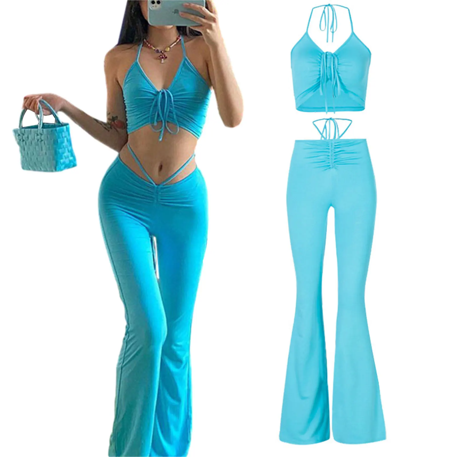 Y2K уличная сексуальный бандажный синий Комбинируемая костюмы 2000s модная одежда на завязках и топ c бретелькой через шею и джинсы с высокой талией, расклешенные брюки комплект из 2 предметов