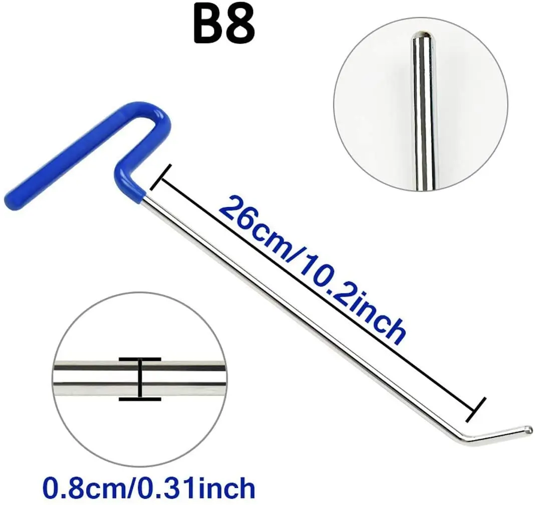 【Разнообразный дизайн 】: острые, плоские и круглые концы; Диаметр: 4 мм-6 мм, Длина: 26 см-57 см, Примечание: размер этого набора как показано на рисунке. Штифт эжектора тоньше, чем другие штифты эжектора, и подходит для небольших вмятин. Выдерживает ограниченный вес. Если вам нужно отремонтировать большие вмятины, выберите большой набор эжекторов. Например, модели A и B набора эжекторов.