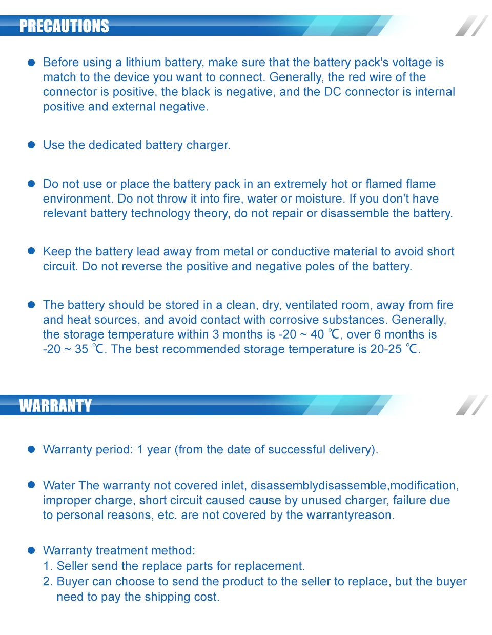 Модель аккумулятора: 12V 20A Тип батареи: 18650 литий-ионная аккумуляторная батарея Номинальное напряжение: 12 В Номинальная мощность: 20Ah Комбинация: 3S8P Мгновенный ток разряда: 40А Ток непрерывного разряда: 20А Напряжение заряда: 12,6 в Время цикла: более 1000 циклов Температура зарядки: 0 ~ 45 ℃ Температура разряда: -20 ~ 60 ℃ Температура хранения: -20 ~ 45 ℃ Вес: около 1,73 кг Размер батареи: 200*120*75 мм Диапазон рабочего напряжения: 9,6 в-12,6 в Защита от перезаряда напряжение: 12,6 в + 0,05 В Защита от переразряда напряжение: 9,6 в + 0,05 В
