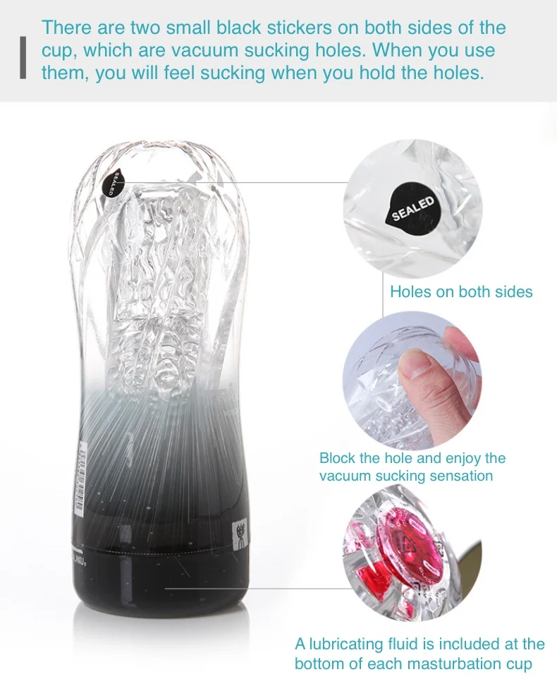 На обеих сторонах чашки есть две небольшие черные наклейки, которые имеют вакуумные отверстия для всасывания. Когда вы используете их, вы почувствуете сосание, когда Держите отверстия.