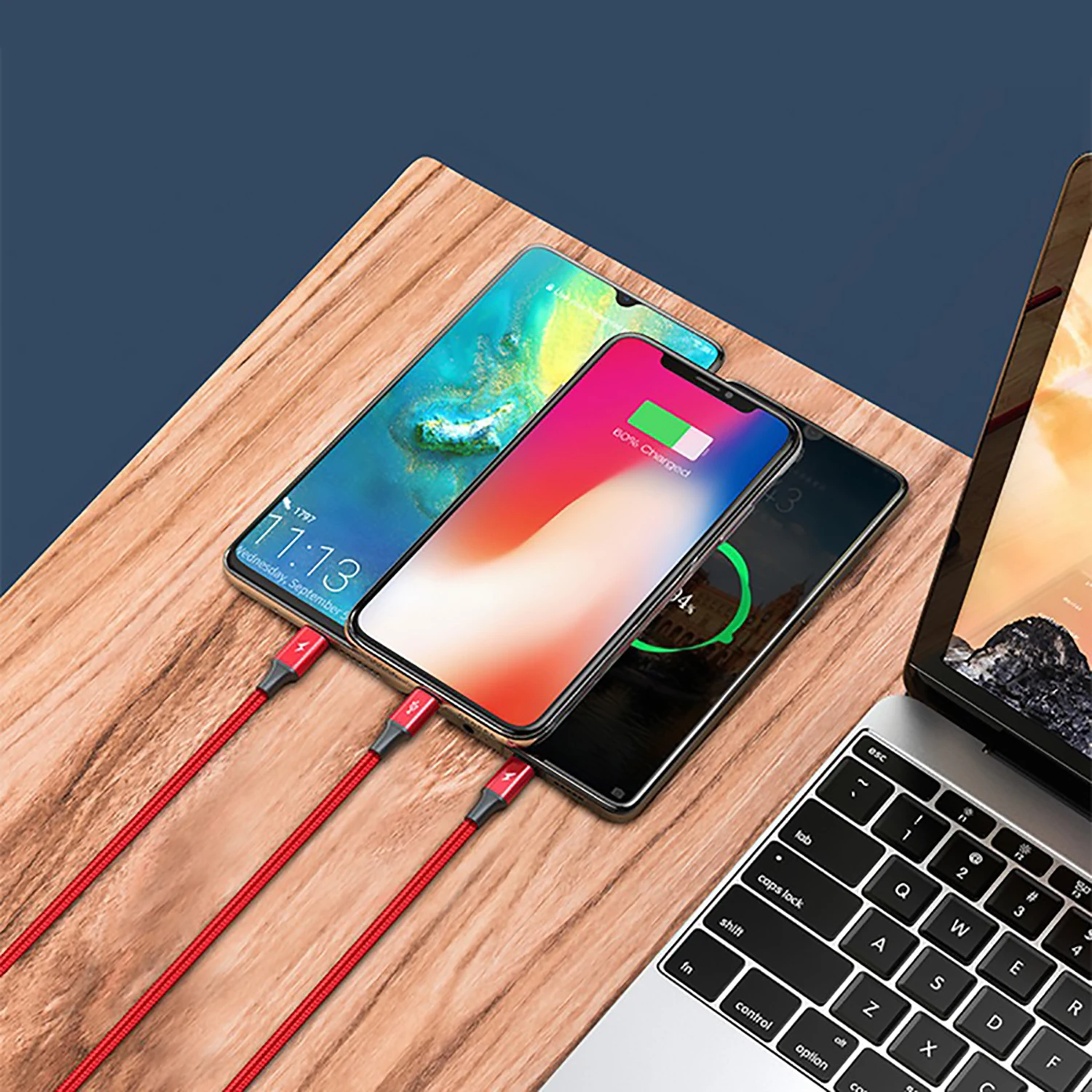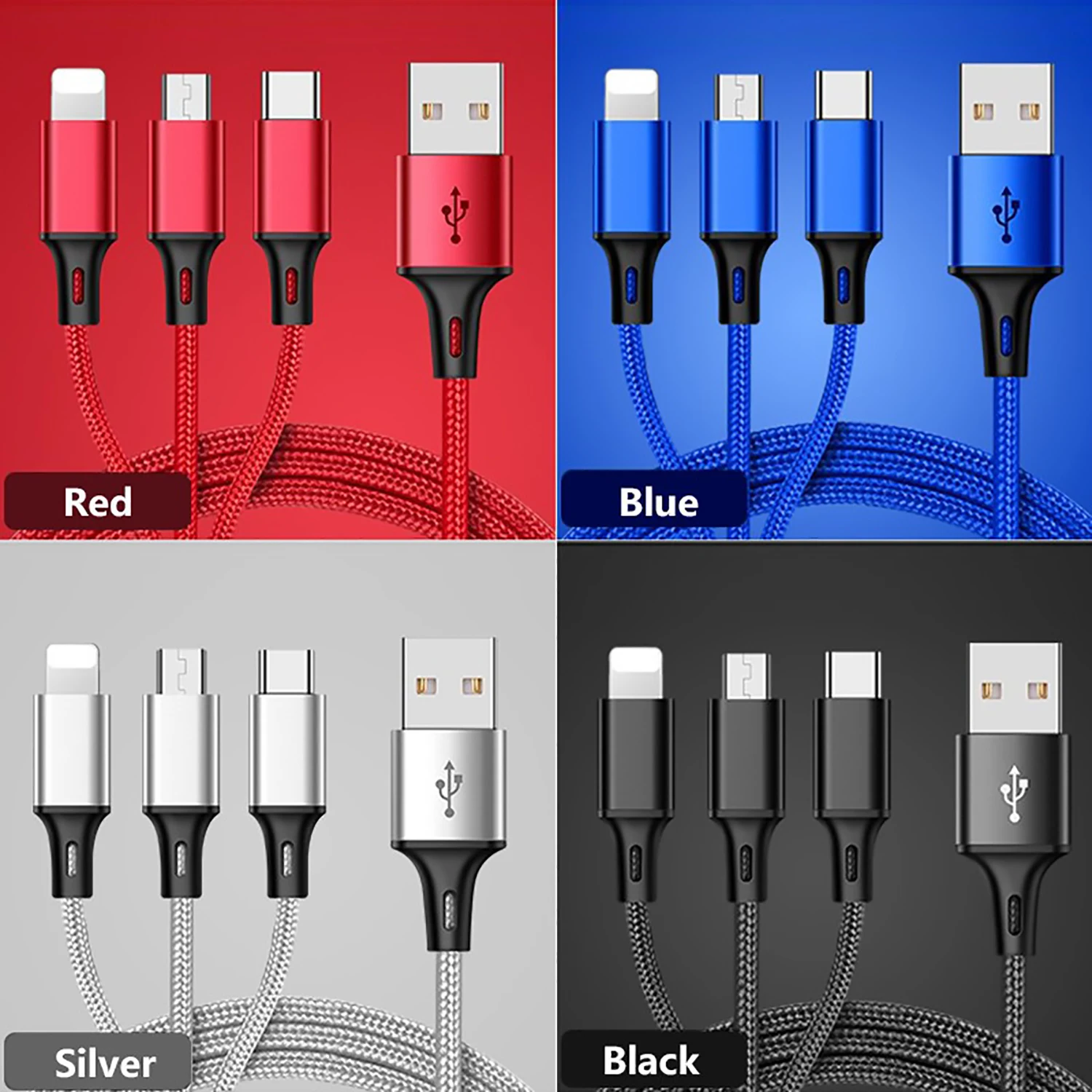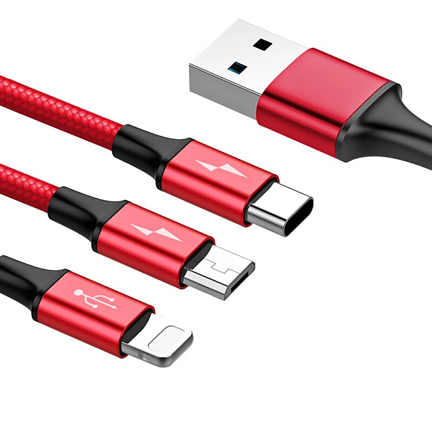 Стиль: 3 в 1.Материал: алюминиевый сплав + подготовленный нейлон.Длина: 1,2 м.Стиль: Модный и простой досуг.Применимая Модель: Apple/Android/Type-C.Цвет: красный, синий, серебристый, черный.Провод изготовлен из ПВХ-сырья, а нейлоновый шнур снаружи сплетен. Износостойкий внешний вид не завязывается. Внешний диаметр проволоки-3,3 мм.Качественный материал для терминалов данных Android, контакт стабильный и долговечный, Apple data line с 5 интегрированными терминалами из материала, совместимый с поддержкой обновления, не воспроизводит окно, зарядка и стабильная защита.Сердечник провода из 108 луженой меди, одиночный медный сердечник с использованием высоких стандартов тока3 в 1 мульти зарядный кабель --- включая 1x8-контактный Lightning, 1xmicro USB,1xType-C поддержка разных устройств, 8-контактный разъем может заряжать разные устройства одновременно.Универсальное удобство использования-длина 1,2 м/3,6 фута, одна сторона с USB-портом, а другая имеет 3 разъема, не нужно носить любой другой кабель, когда вы находитесь в автомобиле, офисе, аэропорт или путешествия.Подходит для: Apple iSO: iPhone 8 / 8 Plus / 7 / 7 Plus / 6S / 6S Plus / 6/6 plus/5S / 5C / 5, iPad Air, iPad mini, iPod Nano 7; Android Micro USB: Samsung Galaxy S7 / S7 Edge / S6 / S5 / S4 / S3,Note 5 / 4 / 3,HTC,LG,Sony,Nexus,Nokia, Motorola,Huawei,Kindle; USB Type C: Note 8,Samsung Galaxy S8 / S8 Plus / A3 (2017) / A5(2017) /A7 / A9 / C9,Huawei P8 / P9 / P10 Lite,Nokia 10,Sony Xperia XL,Nexus 5X/6p/Pixel XL,LG G5 / G6, oneplus 3 / 3t / 5,HTC 10 / U11,Xiaomi 5,Nintendo Switch,MacB. Применяется практически ко всем умным.
