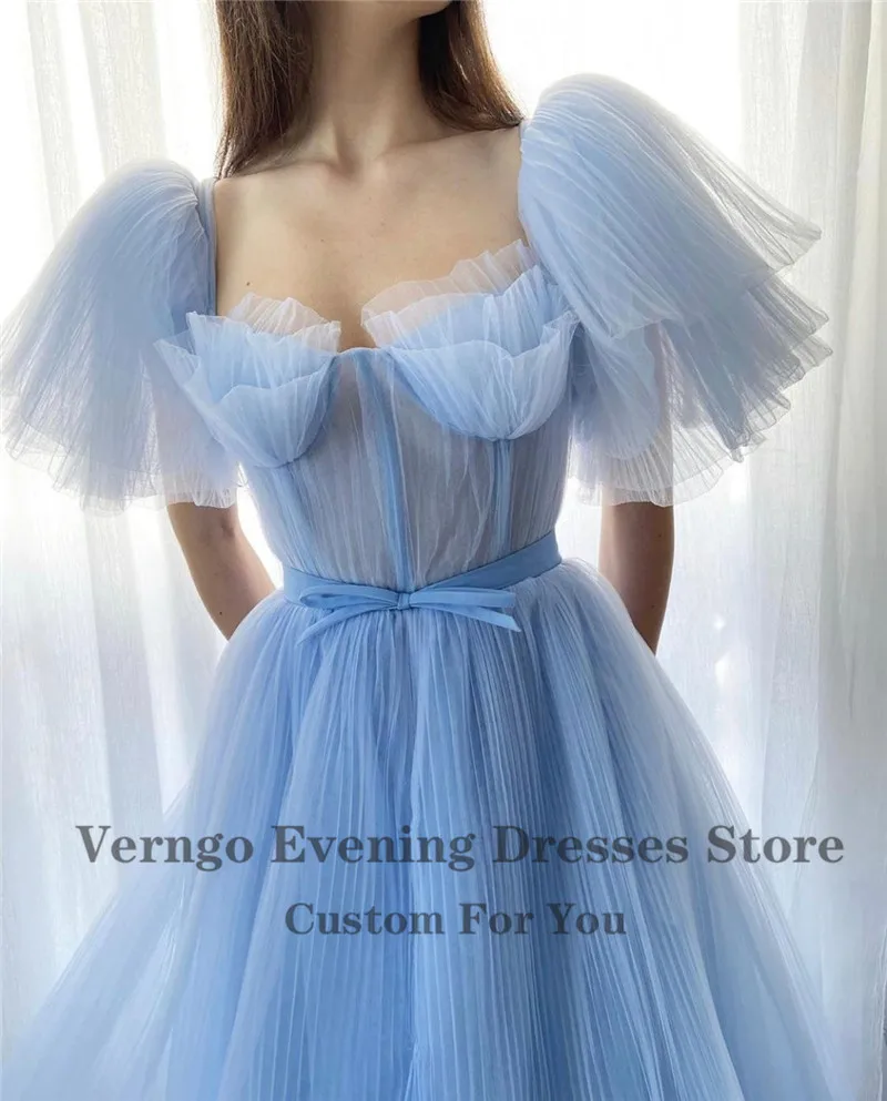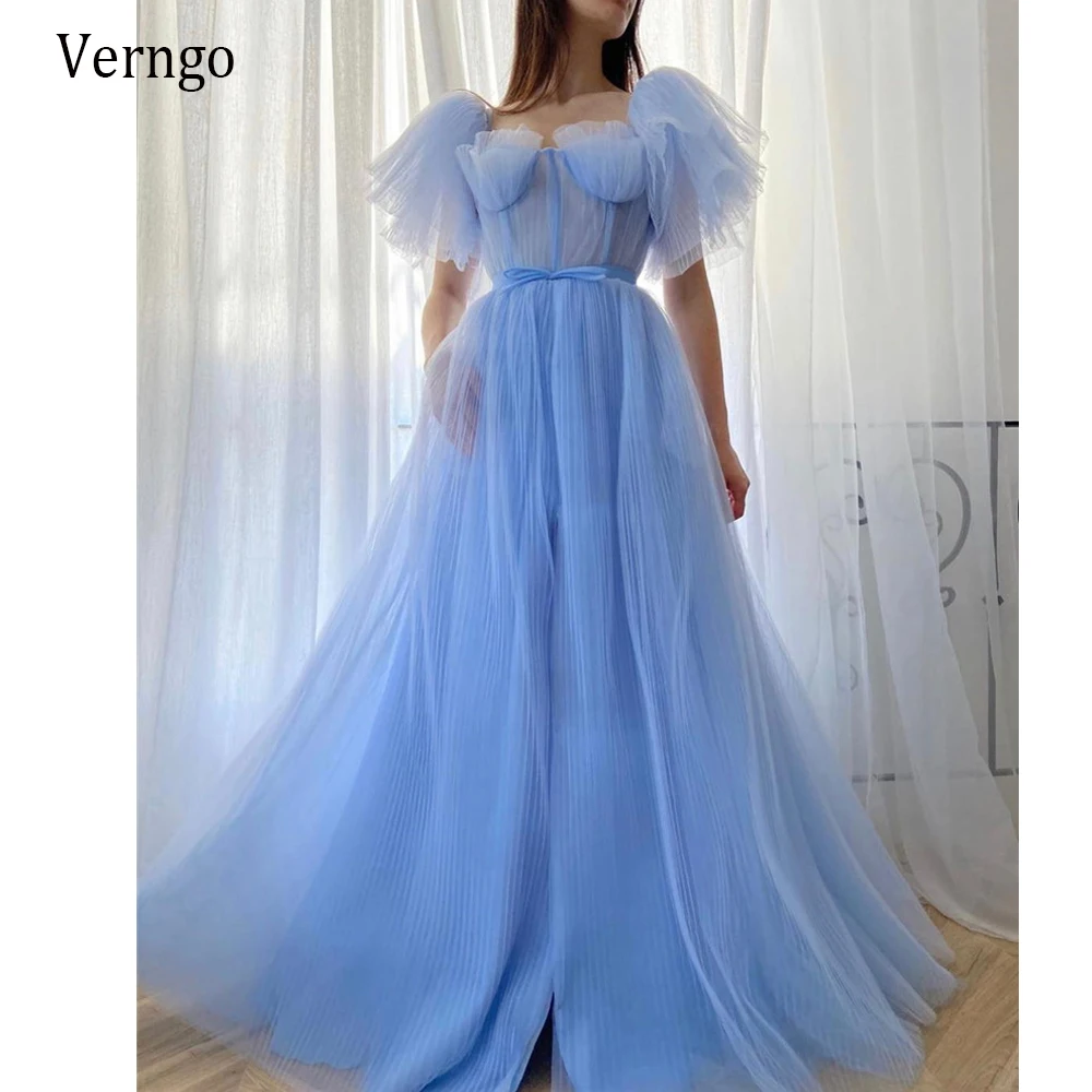 Verngo 2021 элегантные детские синие плиссированные тюлевые платья для выпускного вечера Длинные вечерние платья с короткими рукавами спереди по бокам
