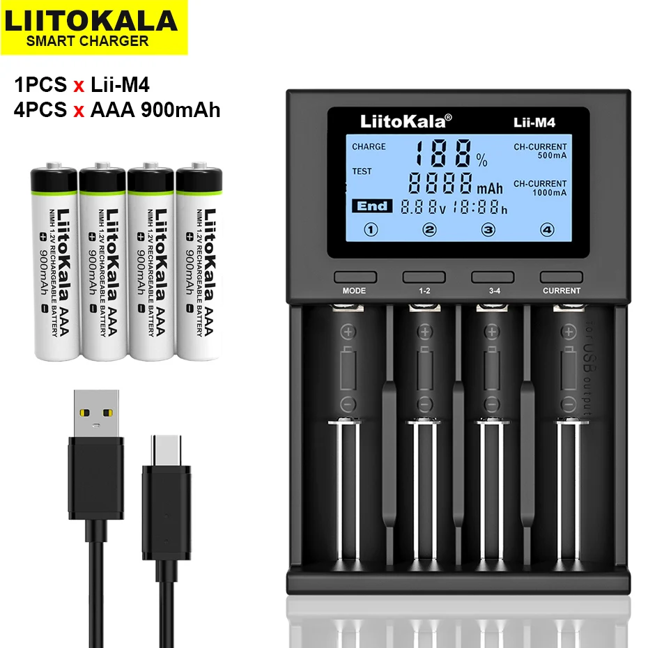 Умное устройство для зарядки никель-металлогидридных аккумуляторов от компании LiitoKala: AAA никель-металл-гидридного 900 мАч * 4 шт 1,2 V Перезаряжаемые Батарея подходит для плюшевых игрушек, мышь, электронные весы, и т. д. + Lii-M4 Зарядное устройство