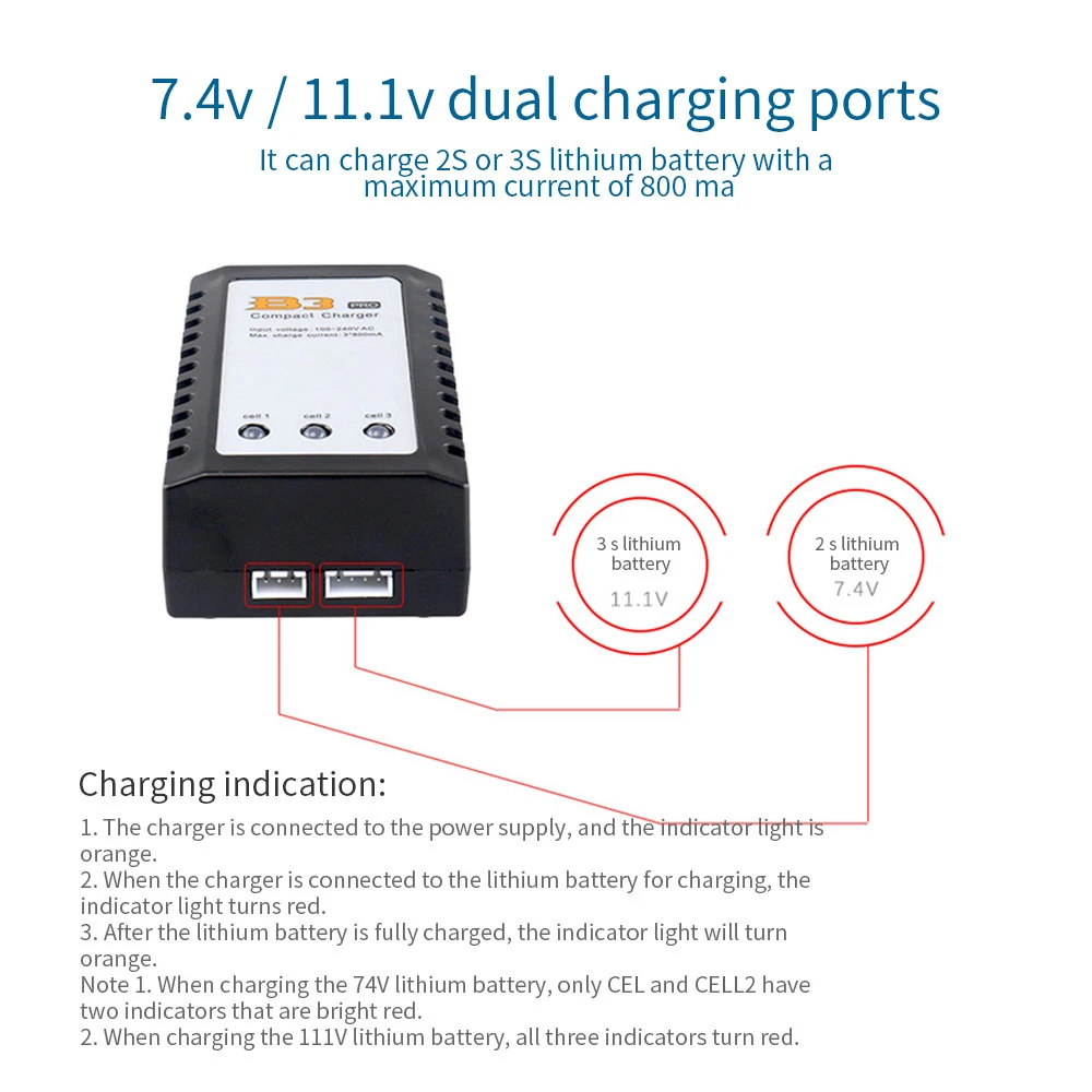 Штепсельная Вилка EU/US для быстрой зарядки IMAX RC B3 Pro, компактное сбалансированное зарядное устройство для 2S 3S, литиевая батарея Lipo, зарядное устройство Спецификация:Цвет: черныйТехнические характеристики: европейские правила/правила СШАРазмер: 90*59*35,5 мм длина линии около 40 смНапряжение источника питания: 110-240 В переменного тока 50-60 ГцВыходной ток: Макс x3 * 800 мАРежим отображения: 3 двухцветных светодиодных индикатора (красный, зеленый, оранжевый)Область применения: 2S (7,4 V) 3S (11,1 V)Инструкции по зарядке:1. Зарядное устройство включено в источник питания, светильник индикатора оранжевый2. Когда зарядное устройство подключено к литиевой батарее для зарядки, светильник индикатора красный.3. Когда литиевая батарея заполнена, светильник индикатора оранжевыйПримечание:1. При зарядке 7,4 V литиевая батарея, только два индикатора CELL1 и CELL2 являются ярко-красного цвета.2. При зарядке литиевой батареи 11,1 В все три индикатора красного цвета. Товары входят в комплект:1 * зарядное устройство1 * зарядный кабель1 * Руководство по эксплуатации