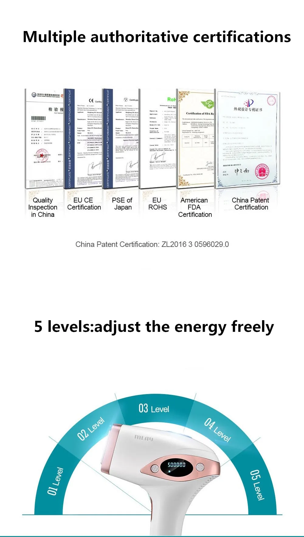 Функция охлаждения льда MLAY IPL удаление волос, с 500000 вспышками позволяют 9-11 индивидуальным сделать удаление волос всего тела. Домашнее лазерное удаление волос интегрировано с механизмом охлаждения ледяного компресса можно использовать одновременно при обработке. Он может поддерживать температуру поверхности кожи в пределах 32-41 ℉ и предотвращать повреждение кожи, покраснение и ожоги.