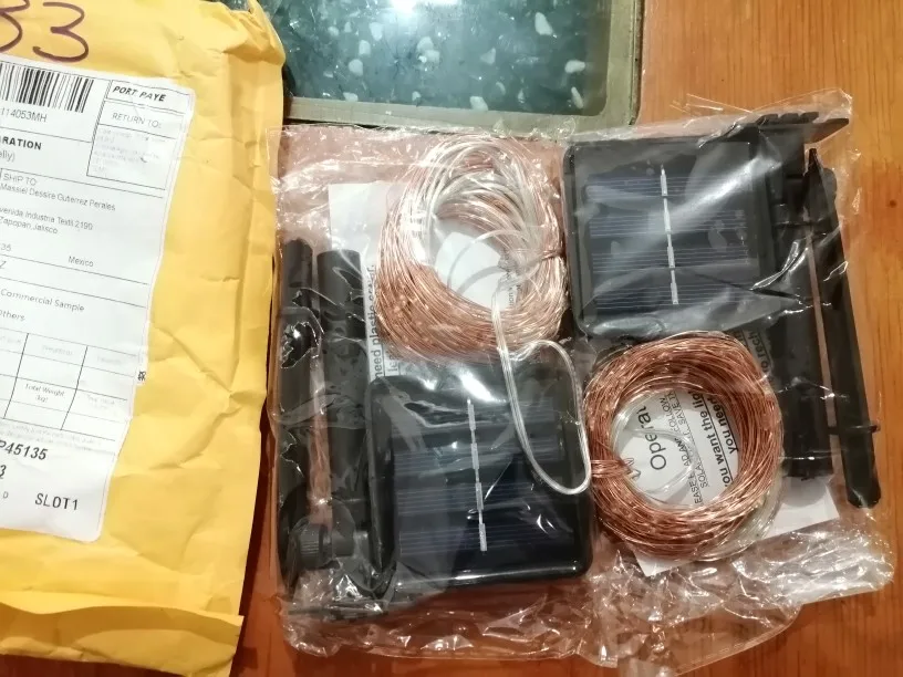 Super recomiendo vendedor, 18 días envío a Bogotá, Colombia, ambos paneles solares encienden perfecto, Alambre con diodos de varios colores y varias velocidades, Nos encantó, voy a conseguir manguera de nivel de la más delgada y se mete dentro para proteger de humedad el alambre.