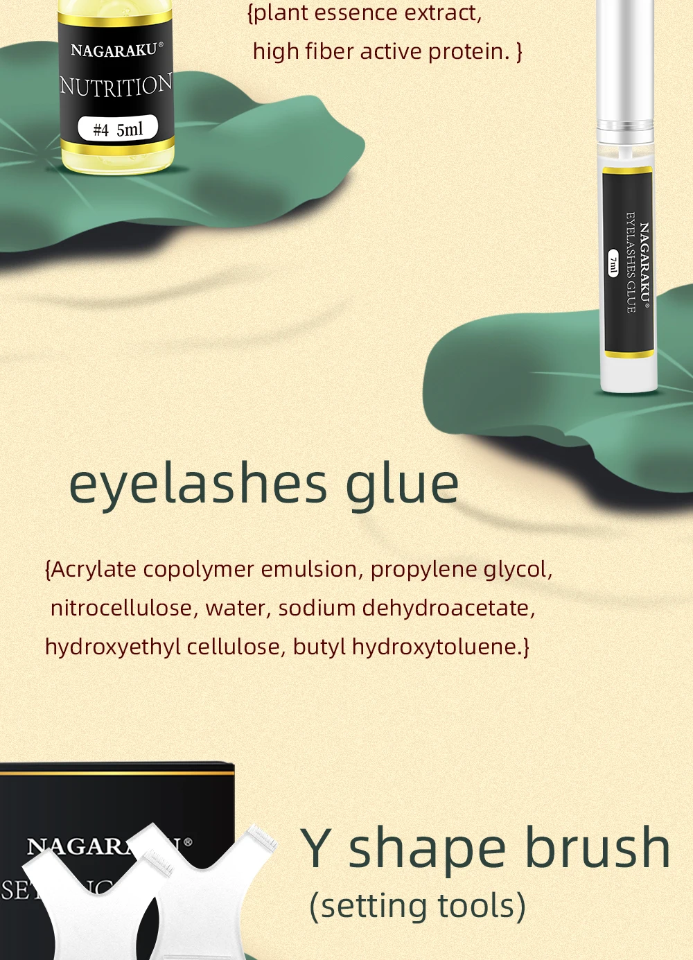 * Пермь: деионизированная вода, растительный экстракт, Белковая кислота,Сущность.* Фиксация: деионизированная вода, растительный экстракт, пропиленгликоль, Белковая кислота, эссенция.* Очищающее средство: вода, растительные экстракты.* Питание: экстракт растительной эссенции, активный белок с высоким содержанием клетчатки.* Клей для ресниц: акрилатная сополимер эмульсия, пропиленгликоль, нитроцеллюлоза, вода, дегидроацетат натрия, гидроксиэтилцеллюлоза, бутилгидрокситолуол.* Инструменты настройки: 2 шт Y форма кисти* Колодки с подъемом: S/M/L всего 3 пары.