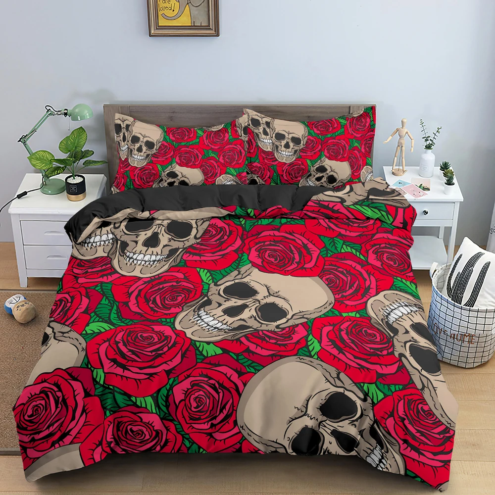 Комплект постельного белья с черепами и красными розами, пододеяльник в стиле тестер с наволочкой, мягкий пододеяльник, постельное белье, односпальное, Двухспальное, двуспальное