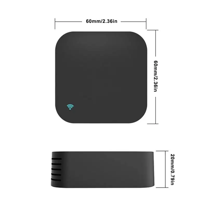 Описание:Умный беспроводной ИК-пульт дистанционного управления S06 Pro оснащен датчиком влажности и температуры и может отображаться в режиме реального времени.Этот умный ИК-контроллер с Wi-Fi поддерживает Голосовое управление и совместим со многими типами голосовых помощников.Этот ИК-контроллер с голосовым управлением поддерживает управление мобильный телефон. Вы можете использовать телефон для управления ИК-контроллером практически из любого места.Этот умный ИК-Контроллер оснащен функцией таймера и позволяет установить расписание управления бытовой техникой.Этот универсальный инфракрасный контроллер может управлять многими видами вещей, такими как телевизор, ТВ-приставка, кондиционер и т. д.Характеристики:Материал: АБС-пластик.Цвет: черный.Вход: постоянный ток 5 В/1 А.ИК-частота: 38 кгц.Частота Wi-Fi: 2,4 ГГц (не для 5,0 ГГц)Поддерживаемая ОС: замена для Android 4,4 и выше, замена для iOS и выше.Размер: S06 Pro: 60x60x20 мм, S06: 50x50x19 мм.S06:Рабочее напряжение: 5 В/1 а постоянного тока.Рабочая частота: 38-56 кгц.Максимальная мощность: 0,55 Вт.Расстояние дистанционного управления: диапазон беспроводной связи: 40 м, инфракрасный: 7 м.Рабочая температура: от 0 ℃ до 40 ℃.(от 32 ℉ до 104 ℉)Тип Wi-Fi: IEEE 802.111b/g/n.S06 pro:Рабочее напряжение: 5 В.Рабочая частота: 38 кгц.Максимальная мощность: 0,55 Вт.Расстояние дистанционного управления: Инфракрасный: ≤ 10 м.Рабочая температура: от 0 до 50 ℃.Примечание:Из–за разных компьютерных разрешений может быть небольшое цветовое искажение.Возможны небольшие погрешности из-за разных измерений вручную.S06 не имеет встроенного датчика влажности и температуры.Посылка1 Универсальный инфракрасный контроллер.1x зарядный кабель.1 руководство пользователя.Упаковочный лист