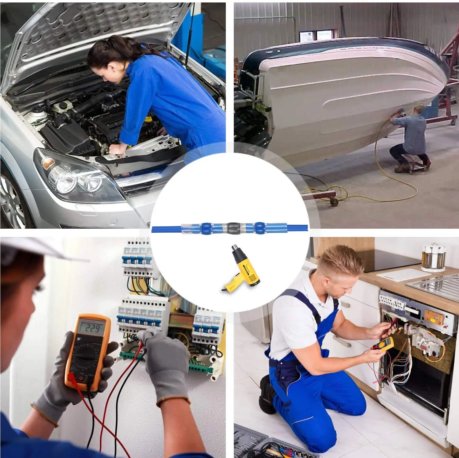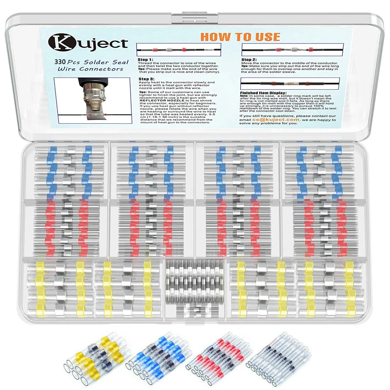 Способ использования: 1. Прокладка двух проводов, которые будут подключаться и выбрать правильный размер соединителя. 2. Подключите соединитель к одному из проводов, а затем скрутите два проводника вместе. 3. Переместите соединитель к середине проводника. 4. Медленно и равномерно наносите тепло на Соединитель с помощью пистолета горячего воздуха с соплом, пока он не расплавится с проводом.