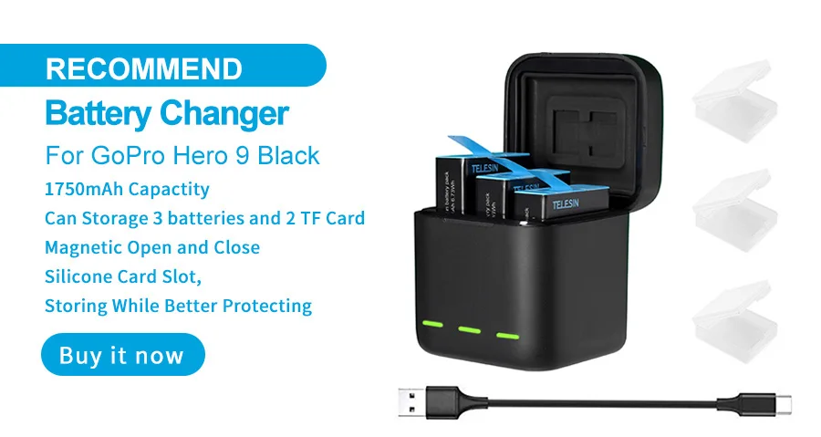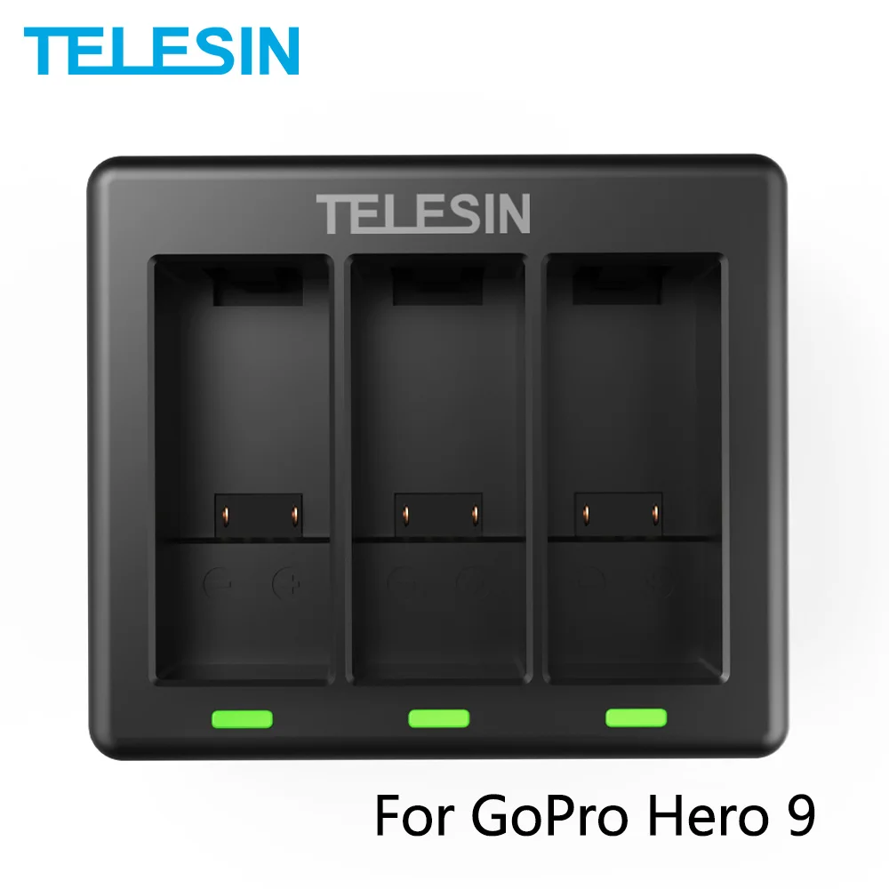 TELESIN-cargador de batera de 3 vas con luz LED, caja de carga para GoPro Hero 9, accesorios de batera para Cmara de Accin negra