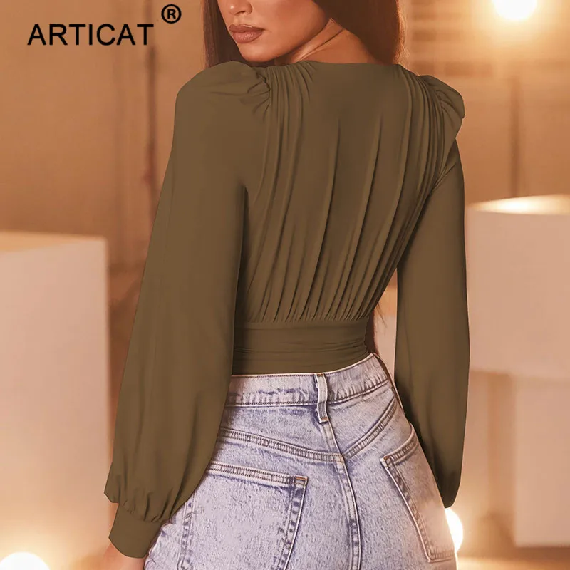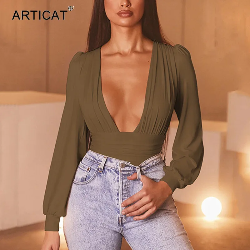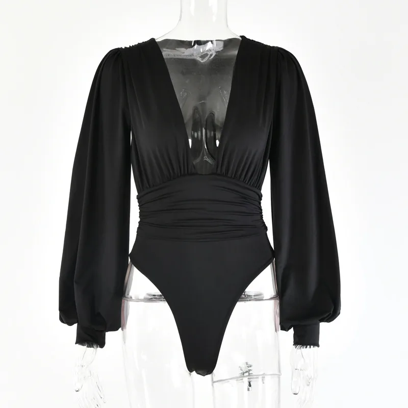 Женский облегающий боди Articat, черный облегающий боди с глубоким v-образным вырезом и рукавами-фонариками, Однотонные эластичные Повседневные Вечерние боди на зиму