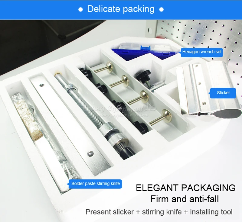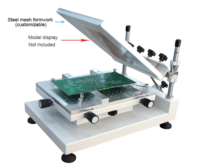 Стальная проволочная рама принимает спиральную винтовую планку, которая может регулировать высоту вверх и вниз, чтобы контролировать толщину печатной платы и количество печатной пасты