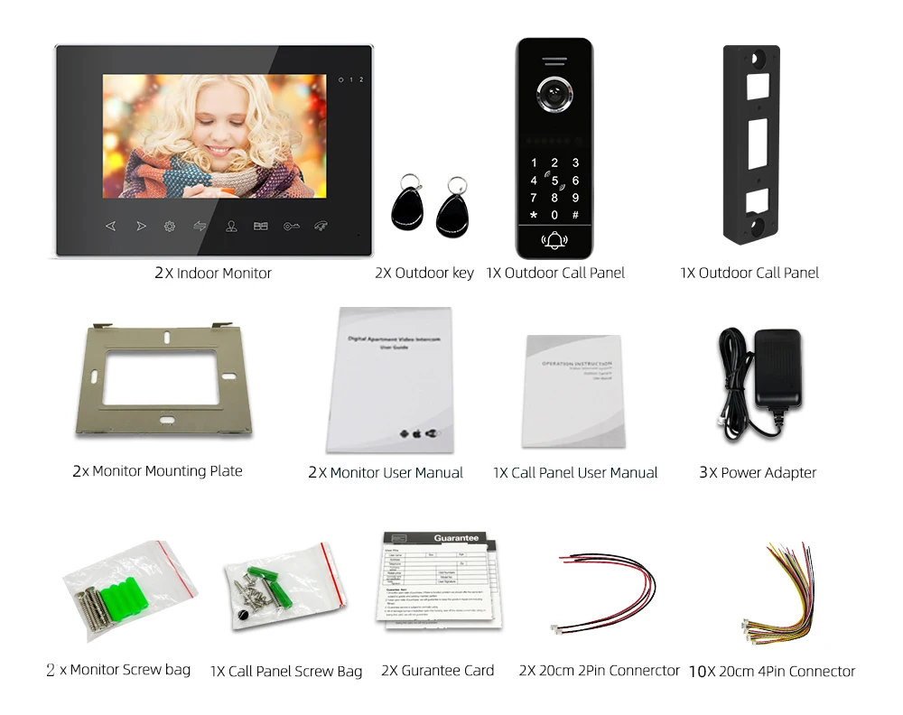 2x внутренний монитор1 наружный дверной Звонок2x Монтажная пластина для монитора1x панель вызова Руководство пользователя2х карта рфид2x гарантийная карта10x 4-контактный разъем2х контактный разъем3x источник питания