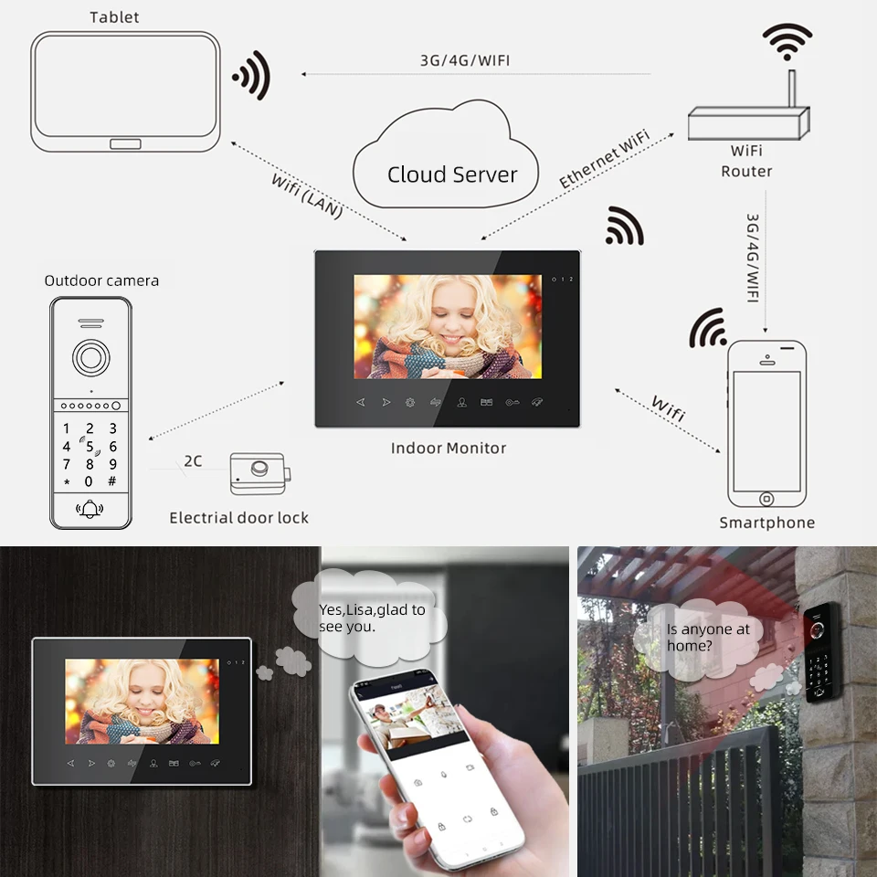 * 7 дюймов полный сенсорный экран, можно легко подключить 2 наружные устройства* Беспроводное подключение Wi-Fi к смартфону, пожалуйста, установите ip-дверной звонок приложения* Подключите монитор к домашнему wifi или сети, если вам нужно подключить к смартфону* Приложение управления в реальном времени, 2 способ обсуждения, разблокировать, запись видео с обувью/изображений* Поддержка разблокировки электрического замка, поддержка подключения различных электрических замков* Экран может использоваться как часы* После успешного подключения, вы можете поговорить с посетителем и разблокировать Электрический замок