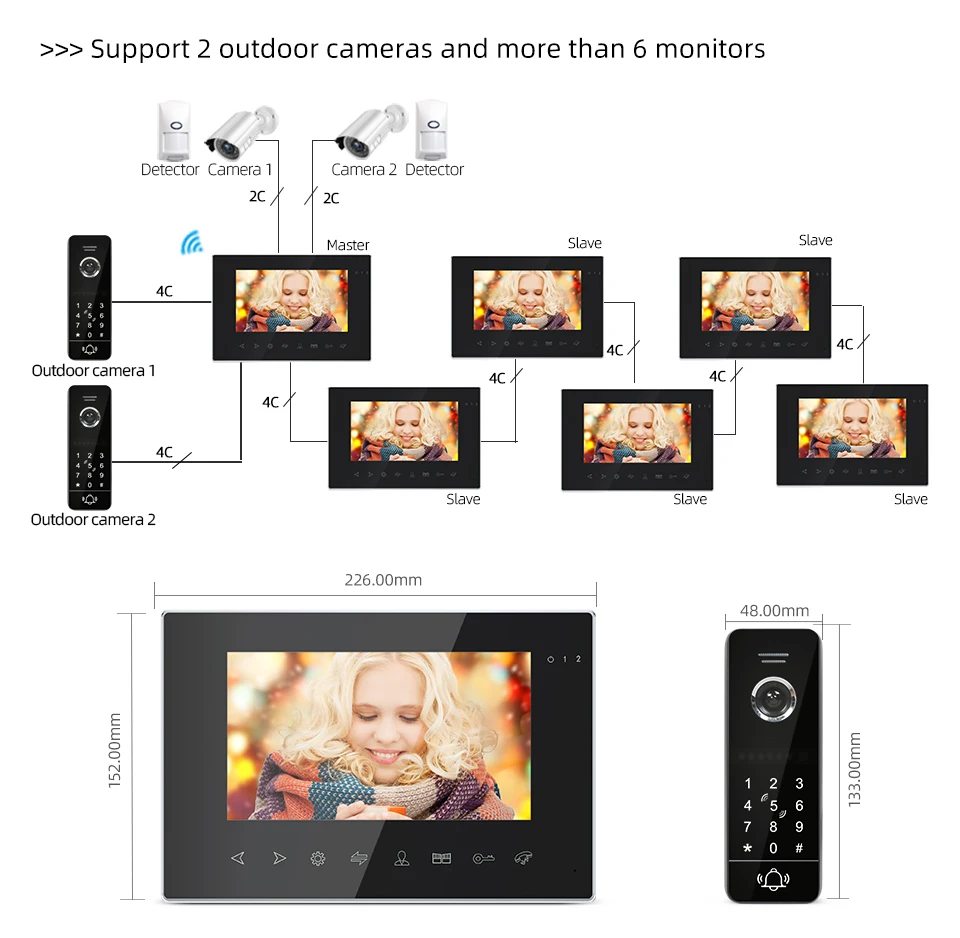 Обратите внимание, что система видеодомофона Wi-Fi не означает, что вам не нужен провод. Монитор поддерживает беспроводное подключение к Wi-Fi или RJ45 для подключения к WIFI, но внутренний монитор и дверной звонок проводной, что гарантирует питание, видео работает стабильно, и вы можете увеличить расстояние