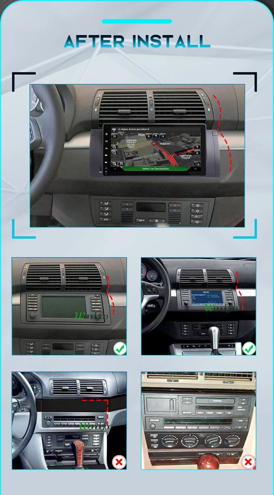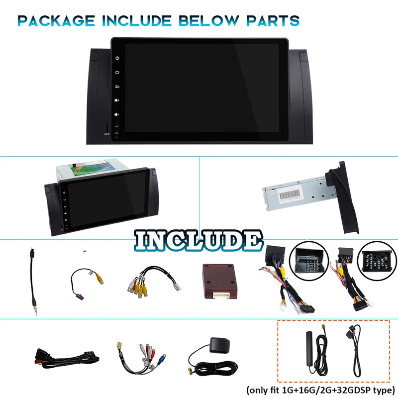 Применимые модели и годыДля BMW 5 Series E39 1996-2007Важные Примечания:1. Пожалуйста, проверьте, является ли оригинальный компакт-диск вашего автомобиля одним размером din, если это так, tihs не может поместиться в ваш автомобиль.2. Пожалуйста, проверьте, есть ли рамка в центральной консоли вашего автомобиля, если есть, пожалуйста, снимите рамку сначала, чтобы закончить установку.3. Пожалуйста, обратите внимание, что если ваш радиоприемник имеет 17 контактов и 4 указанных контакта пусты, этот блок не может поместиться в вашем автомобиле.4. Пожалуйста, проверьте, находится ли порт радиоантенны вашего автомобиля в багажнике автомобиля, если это так, вам нужно заказать Удлинительный кабель радиоантенны и антенный адаптер для завершения установки.1. Подарок = инструменты + микрофон + копия файлов карты в GPS внутри (вы можете использовать gps напрямую, не включая карту)