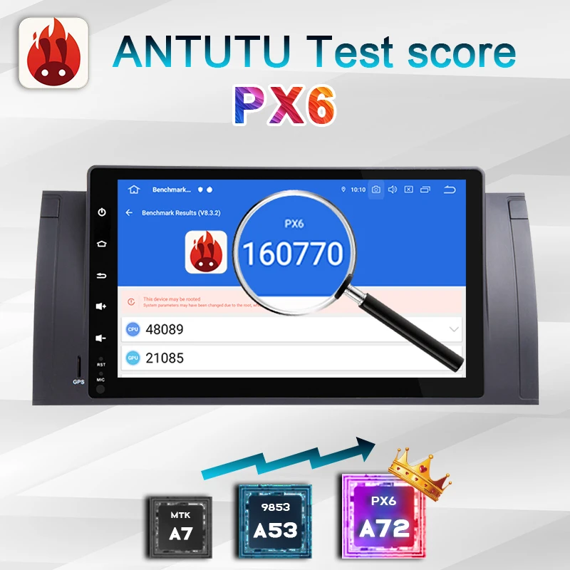 PX6PX6 является лучшим чипом на рынке в настоящее время, он работает быстрее, чем все другие типы. Балл ANTUTU составляет 160770, что лучше 9853 4G + 64G, PX5 и всех других типов 4 + 64G на рынке. По сравнению с другими радио типа fo, PX6 radio может загружать больше видов приложений android с android market, и приложение может работать лучше.