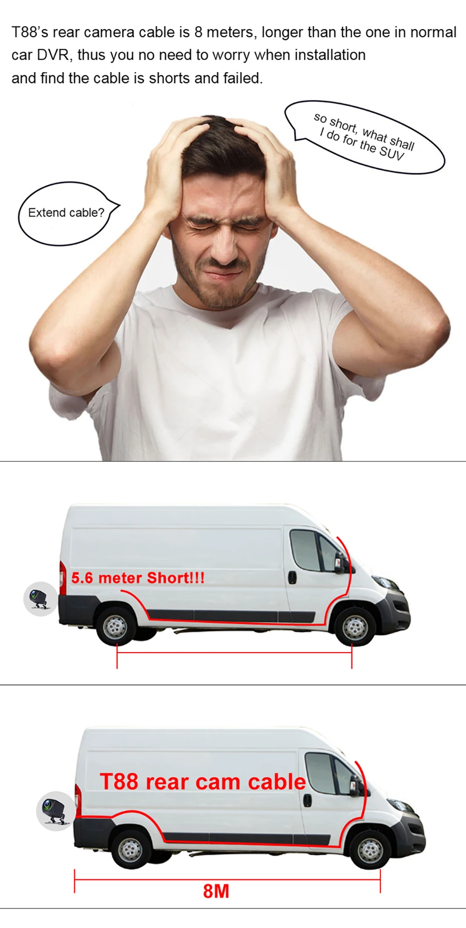 T88 оснащен 4 камерами, более важно, что 4 камеры могут записывать одновременно.Это запись передней, задней и правой левой камерой.Кабель задней камеры 8 метров, другие 3 камеры-кабель 3,5 метра.