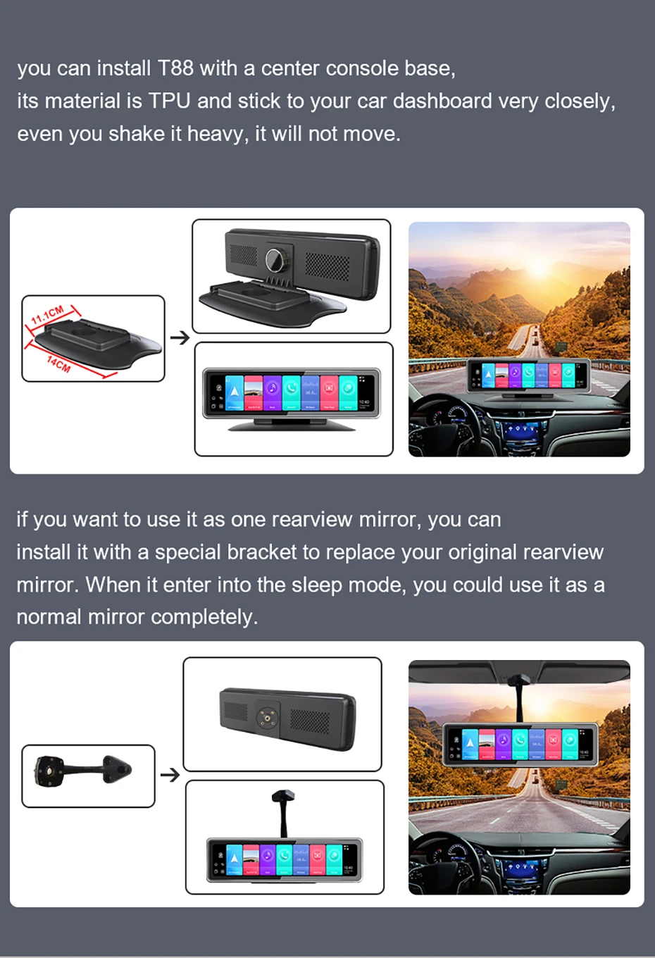 * Основание центральной консолиРазмер основания 11,4*14 см, его материал-ТПУ и может приклеиваться к приборной панели плотно, не нужно беспокоиться о том, что он будет свободно или свободно* Специальное креплениеВы можете выбрать один специальный кронштейн для замены оригинального зеркала заднего вида. Когда экран выключен, вы можете использовать его как одно обычное зеркало заднего вида.