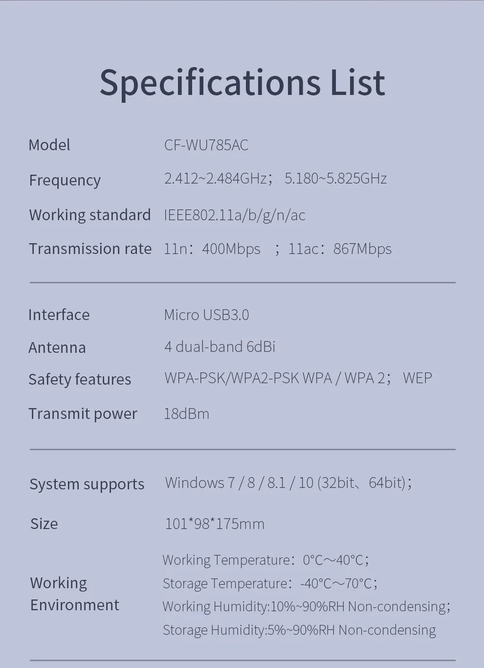 Wireless Frequency2.412~2.484GHz 5.180~5.825GHz