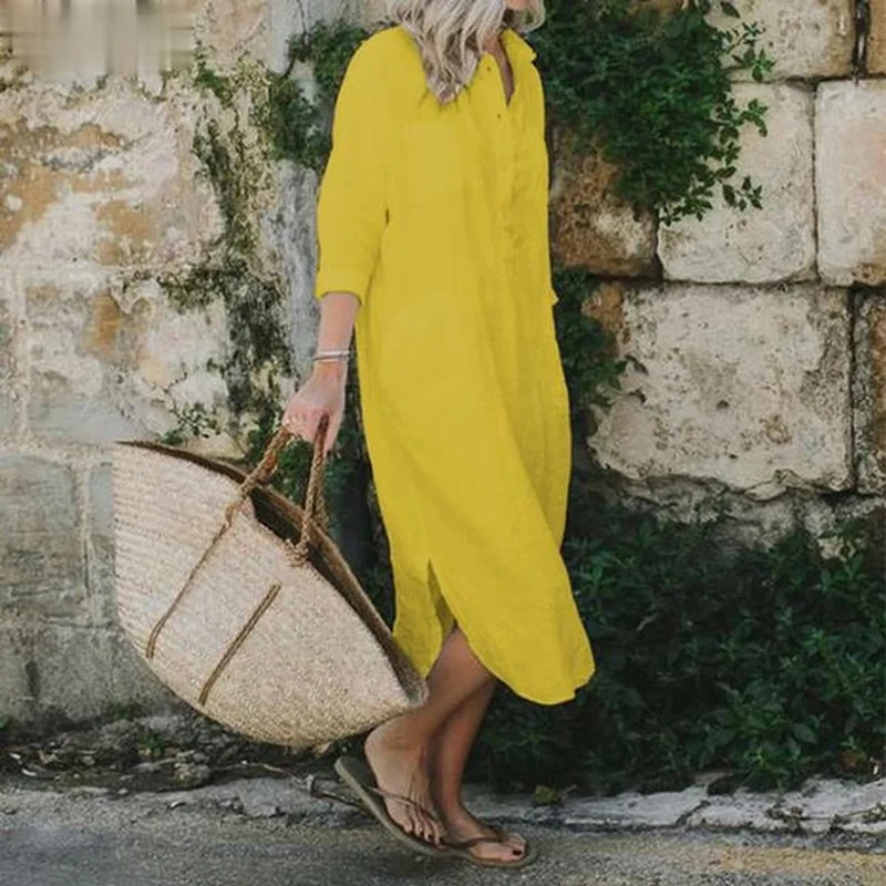 Платье-рубашка женское на пуговицах, однотонное Повседневное платье-рубашка до середины икры с длинным рукавом и разрезом, Пляжная свободная одежда, весна-лето