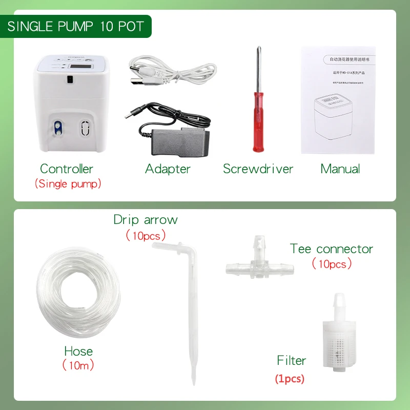 Один насос 10 горшков: 1 контроллер одного насоса, водопроводная труба 10 метров, 10 тройных труб, 10 капельных стрел, 1 потайная головка, Кабель-адаптер 1,2 м, 1 USB-кабель, 1 отвертка, 1 Инструкция по эксплуатации