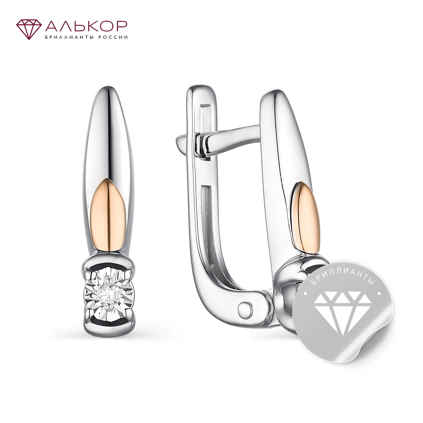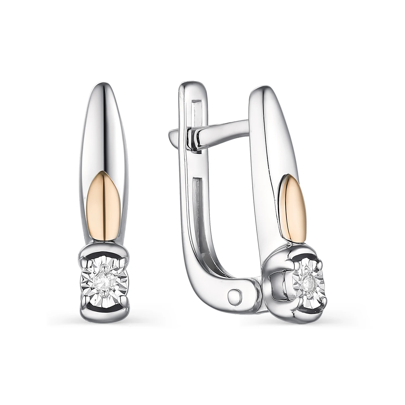 Женские серьги английский замок АЛЬКОР из родированного серебра 925 пробы и золота 585 пробы и золота 585 пробы с 2 бриллиантами. Мы покрываем серебро слоем родия толщиной 0,4 мкм, чтобы драгоценный металл стал гипоаллергенным, получил благородный платиновый блеск и не потемнел. В этом украшении серебро - основа, а золото - декоративный элемент в виде золотой пластины 585 пробы. Вставка: 2 Бриллианта Круг 17 120-200 2/3А, карат. вес: 0,013. Ширина изделия: 3,2 мм. Средний вес: 2,2 гр.