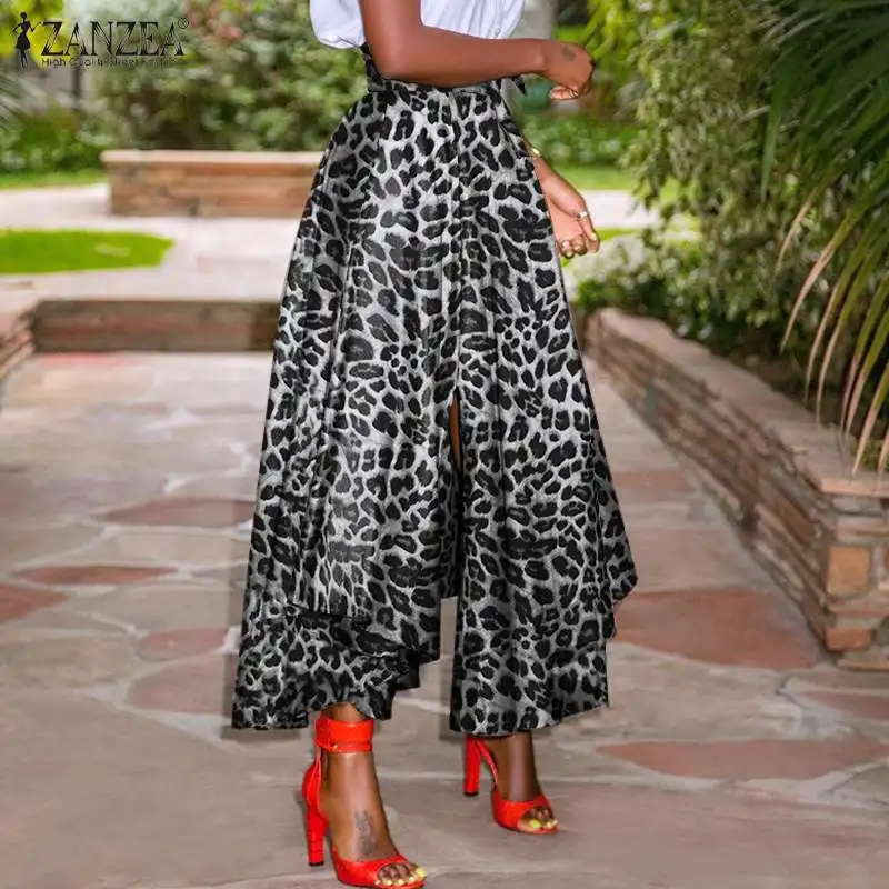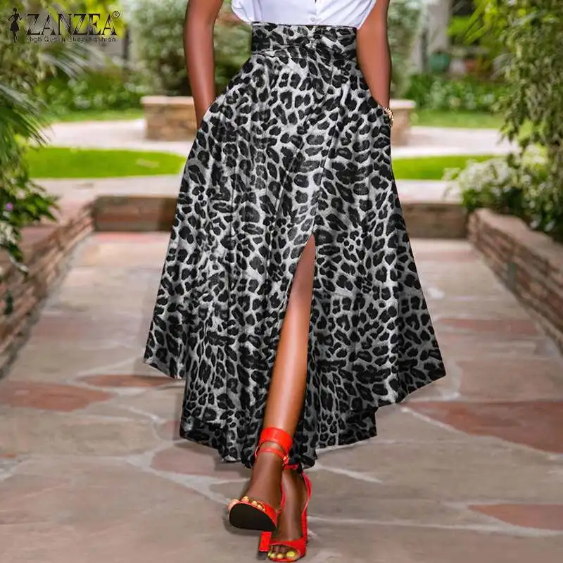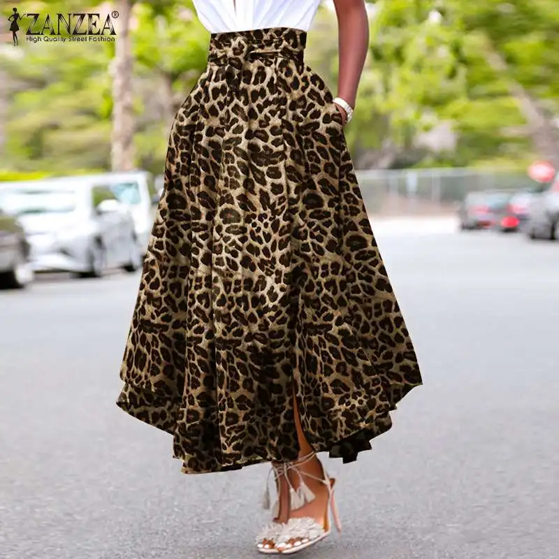 Юбка женская с леопардовым принтом, модная трапециевидная Макси-юбка на молнии, Повседневная Длинная ассиметричная с карманами, ZANZEA2021