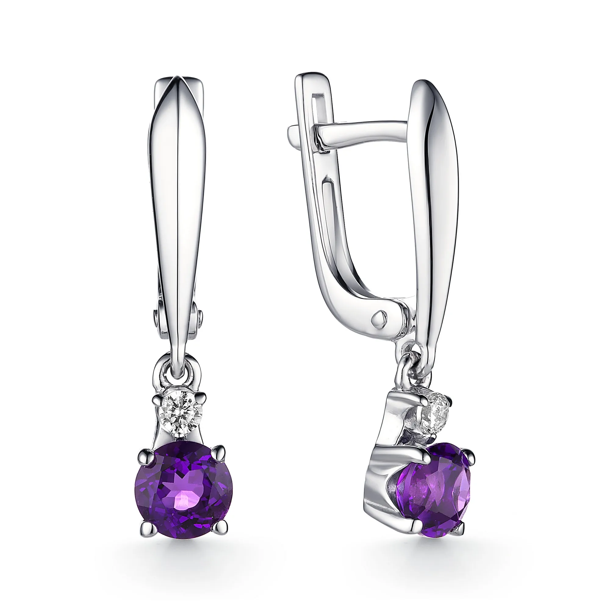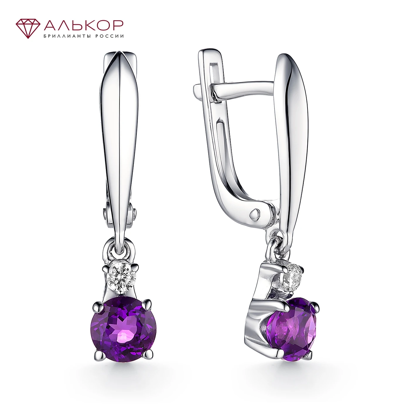 Женские серьги длинные АЛЬКОР из родированного серебра 925 пробы с 2 аметистами и 2 фианитами. Ширина изделия: 5 мм. Средний вес: 3,1 гр.
