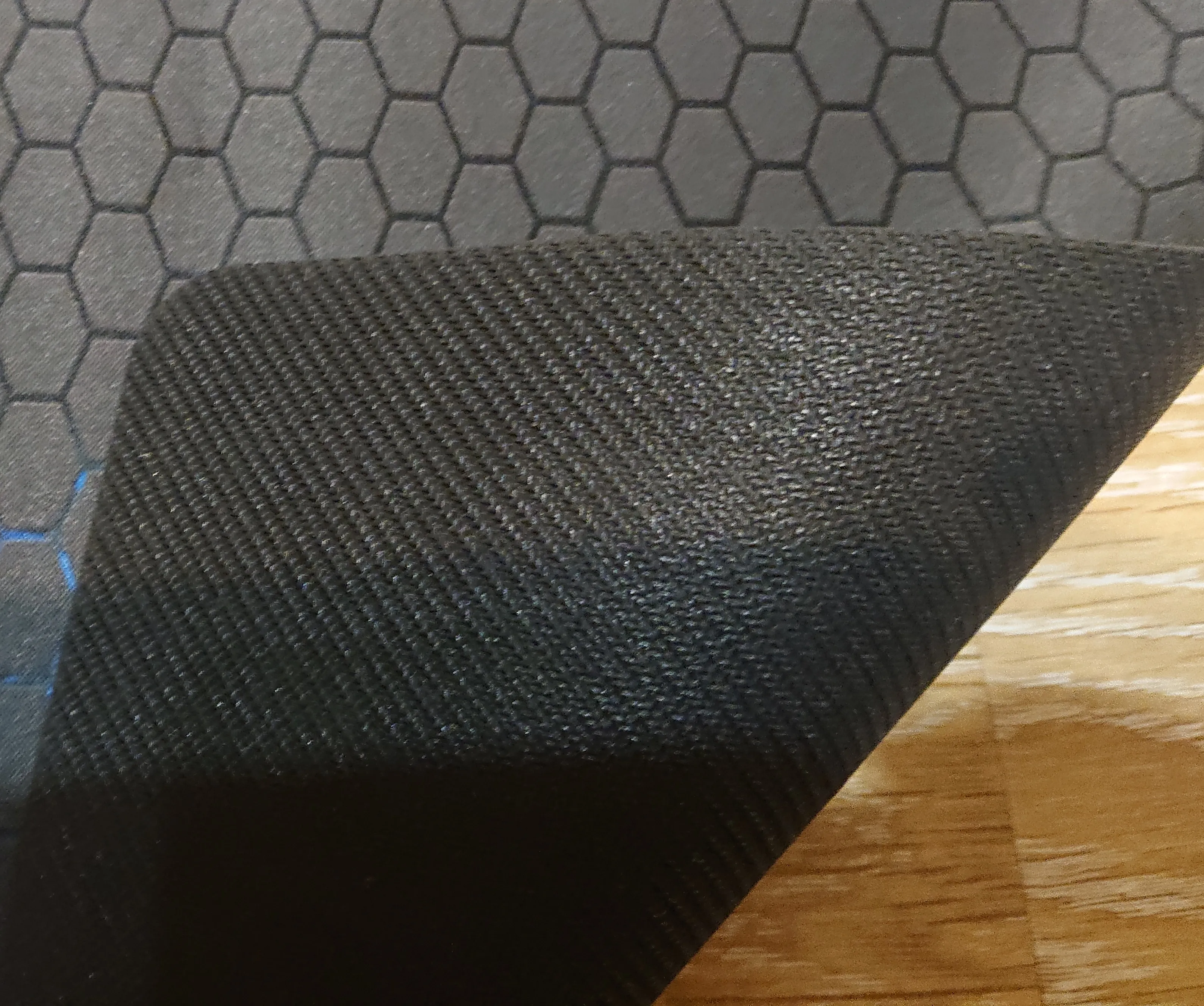 Выглядит как на фото, поверхность приятная на ощупь. Подложка из очень мягкой резины, на столе не скользит. Единственное, ковёр не прошит по периметру, это немного смущает, посмотрим, на сколько его хватит по времени. А продавец все сделал хорошо, отправка отслеживалась на всем пути.