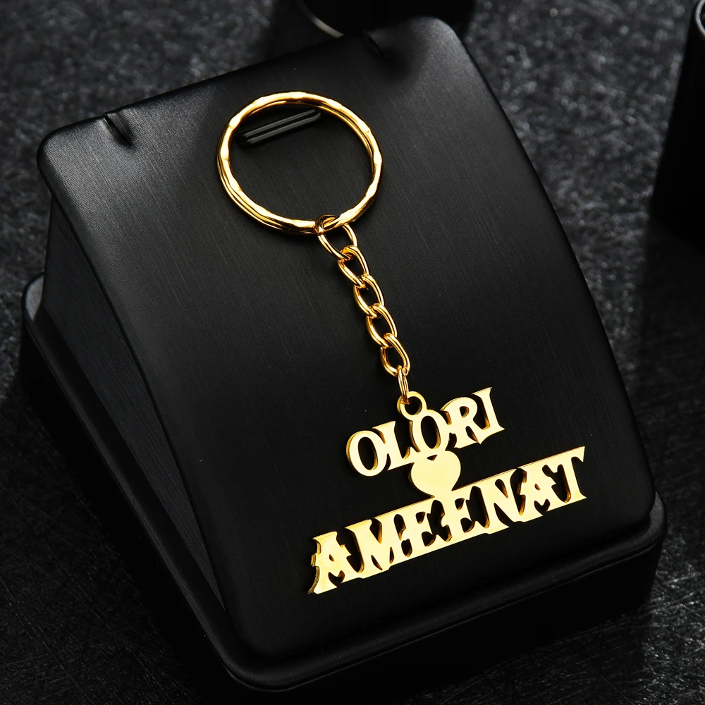 Имя:Goxijite пользовательские двойное имя сердце брелки для женщин мужчин персонализированные письмо тиснением кольцо цепь брелок прекрасный подарок