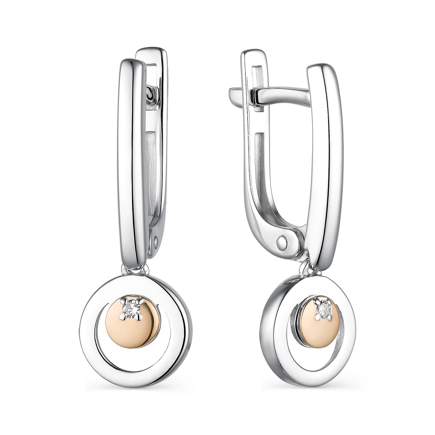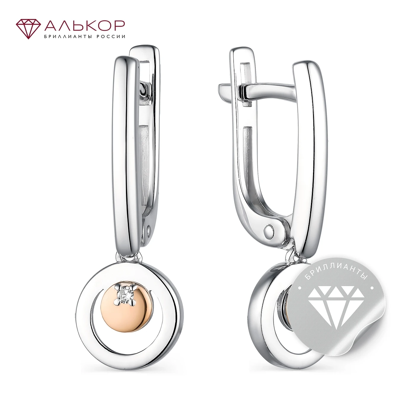 Женские серьги длинные АЛЬКОР из родированного серебра 925 пробы и золота 585 пробы и золота 585 пробы с 2 бриллиантами. Вставка: 2 Бриллианта Круг 17 120-200 2/3А, карат. вес: 0,013. Ширина изделия: 7,9 мм. Средний вес: 2,79 гр.