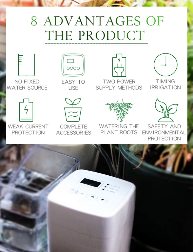 Автоматическое устройство для полива цветов имеет три режима электропитания: адаптер, usb-кабель и аккумулятор. Вы можете выбрать один из них