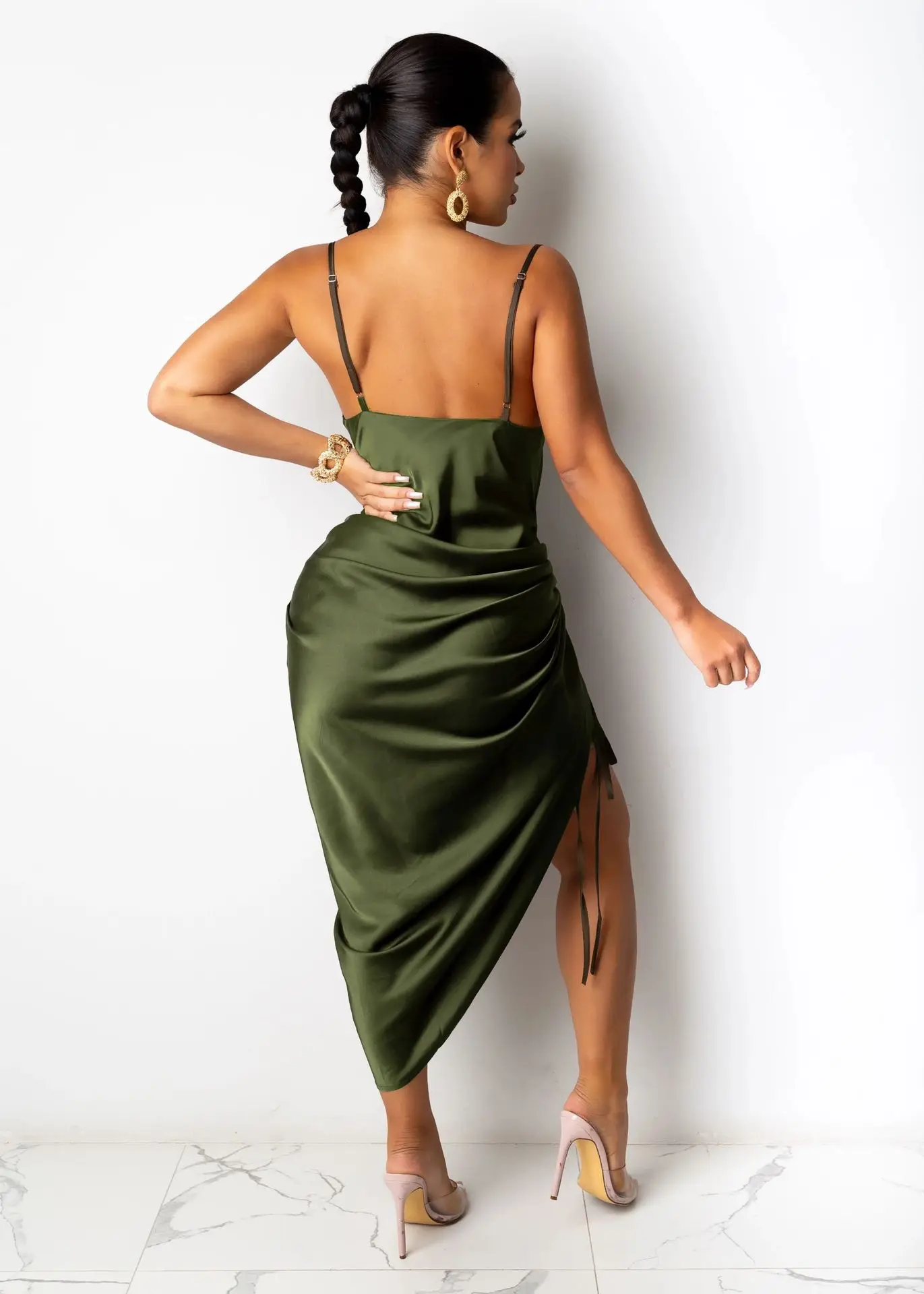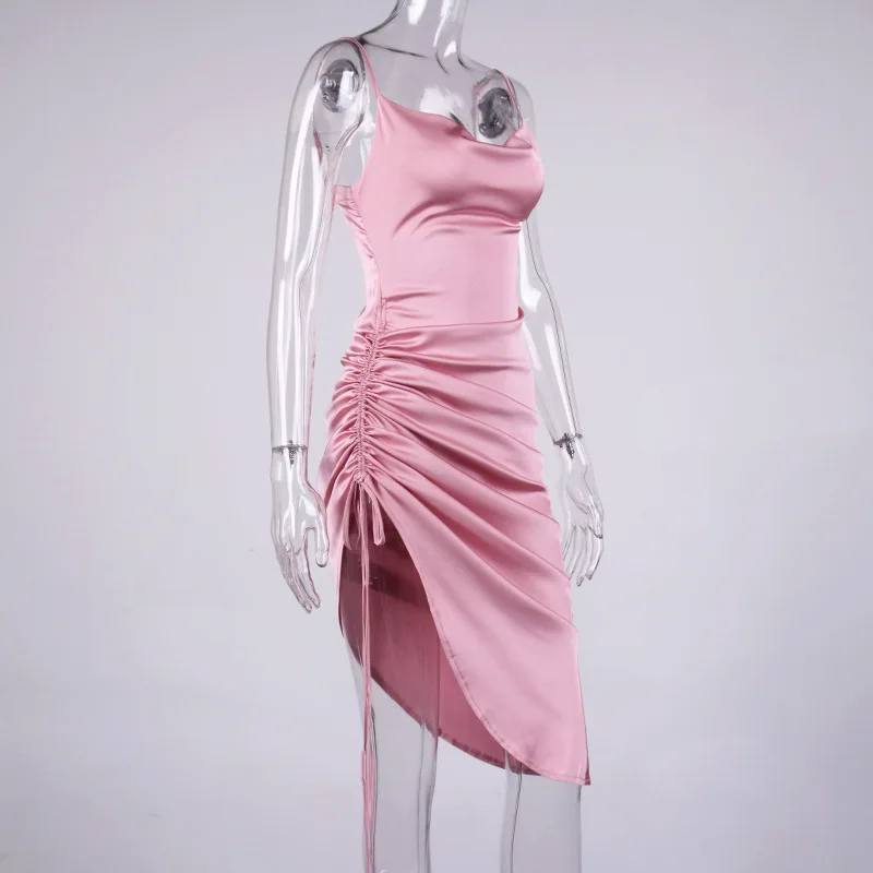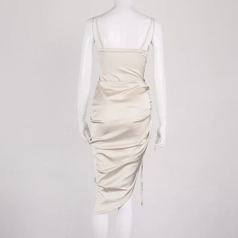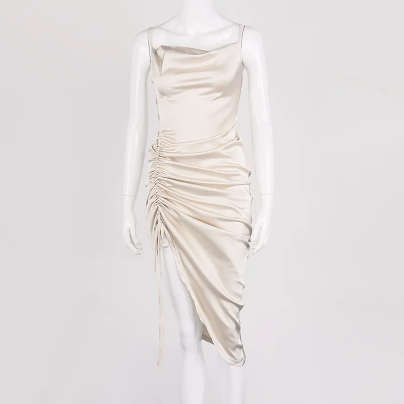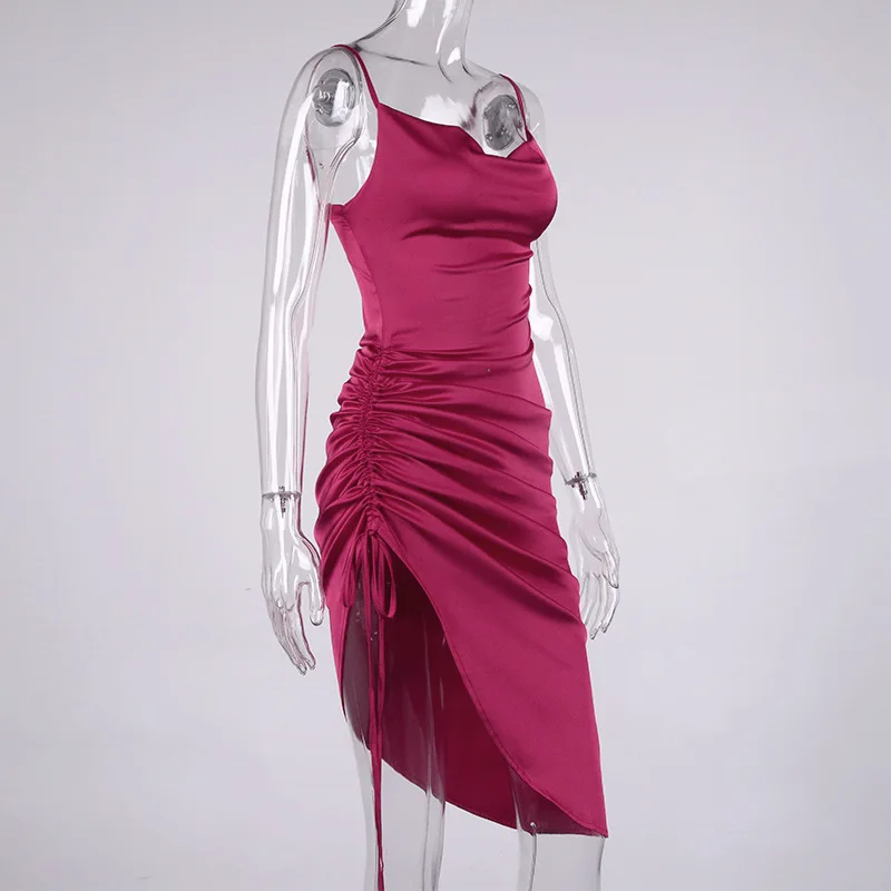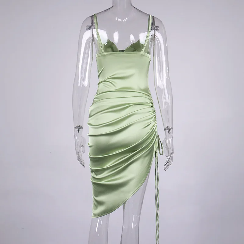 Летние 2021 Ruched сатиновое летнее платье на завязках на тонких бр...