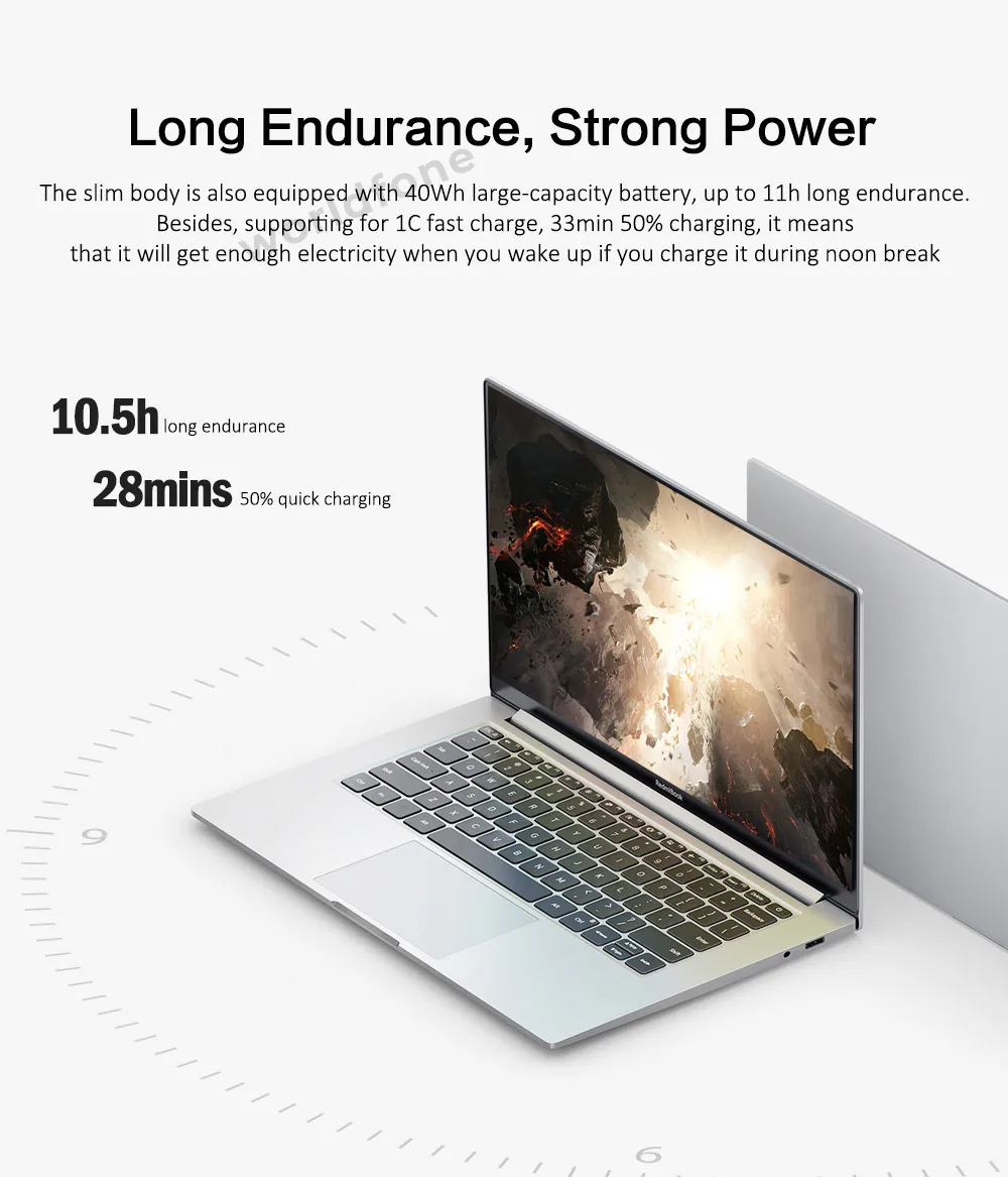 Емкость аккумулятора 40 ватт-час (мин), адаптер питания 65 ВтПоддержка 1С быстрой зарядки, зарядка 50% мощности за 28 минут под отключением ⊃ 2;10,5 часов локального воспроизведения видео, 8,5 часов онлайн-воспроизведения видео и 7,5 часов просмотра веб-страниц