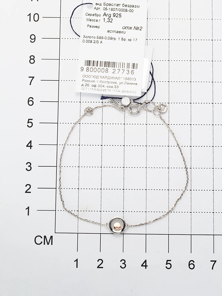 Женский браслет со вставками АЛЬКОР из родированного серебра 925 пробы и золота 585 пробы и золота 585 пробы с 1 бриллиантом. Мы покрываем серебро слоем родия толщиной 0,4 мкм, чтобы драгоценный металл стал гипоаллергенным, получил благородный платиновый блеск и не потемнел. Вставка: 1 Бриллиант Круг 17 120-200 2/3А, карат. вес: 0,006. Ширина изделия: 7,8 мм. Средний вес: 1,37 гр.