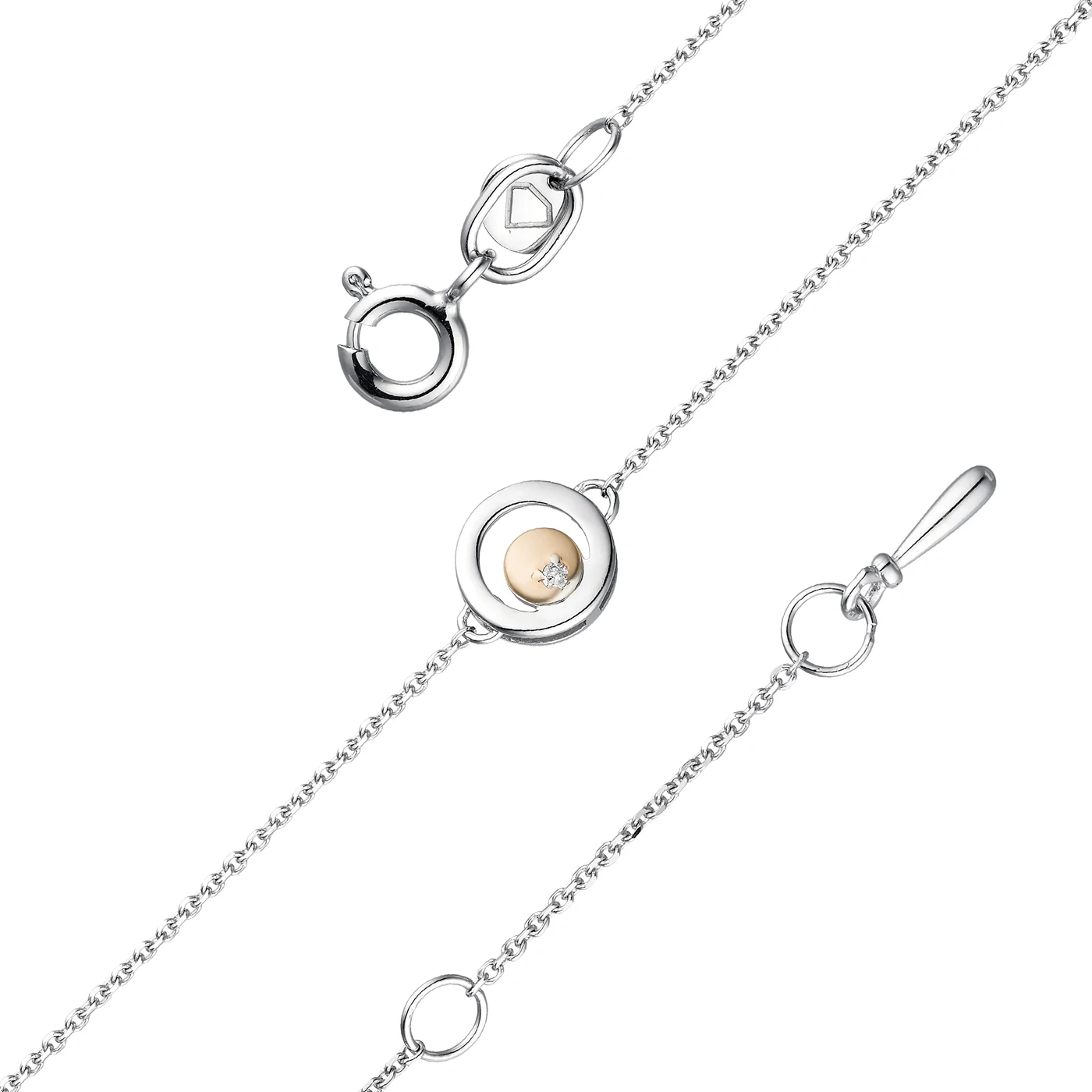 Женский браслет тренд 2021 со вставками из родированного серебра 925 пробы и золота 585 пробы с 1 бриллиантом.