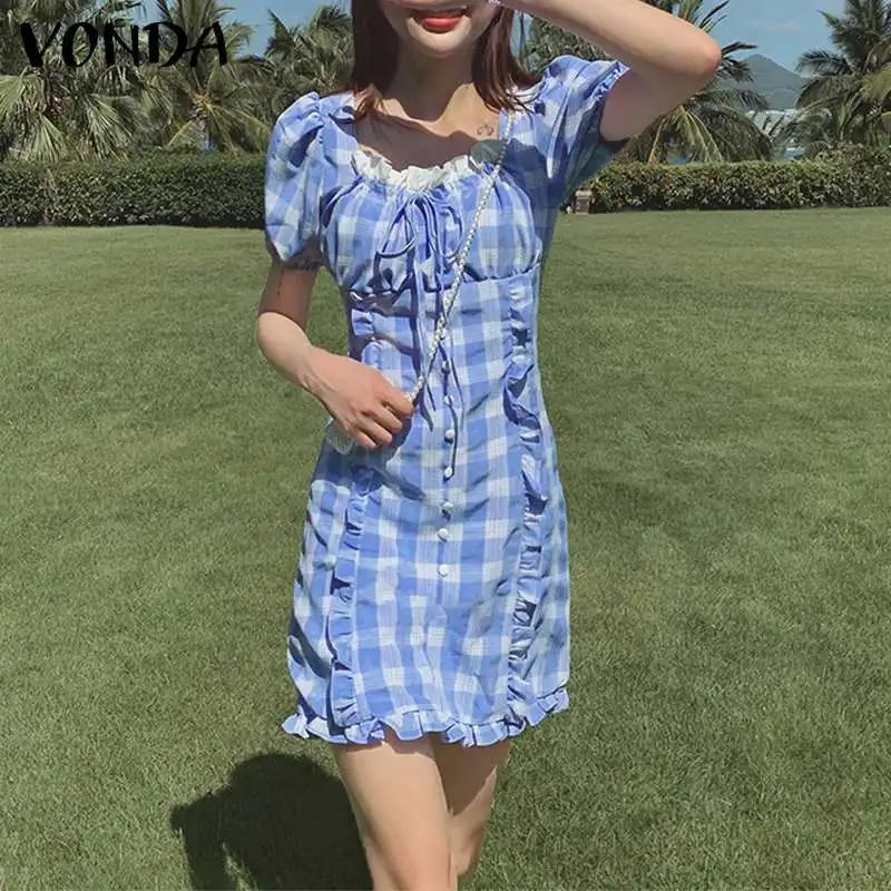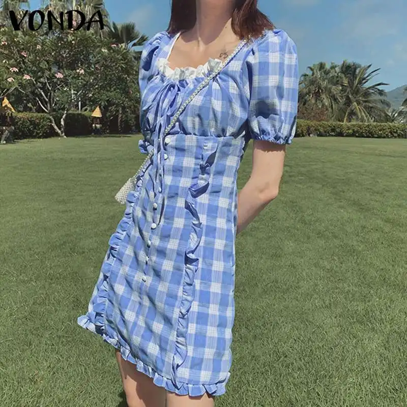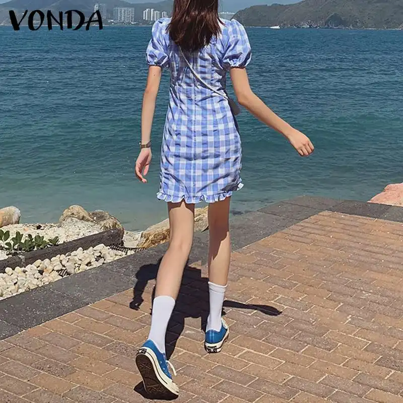 Женское элегантное мини-платье 2021 VONDA, летние клетчатые платья средней длины с коротким рукавом, платье