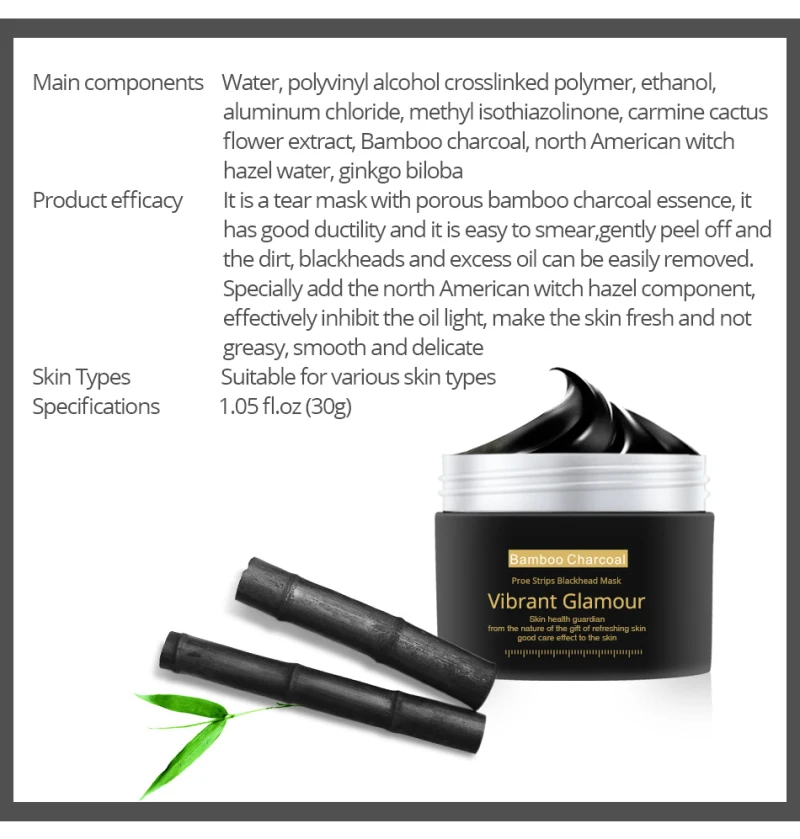 Это пористая маска из бамбукового древесного угля со слезоточивым газом, он обладает хорошей пластичностью, легко смазывается и удаляет грязь, излишки масла, а черные точки легко удаляются. Специально добавленный североамериканский компонент ведьмы орешника, эффективно подавляет светильник, свежая и нежирная кожа, гладкая и нежная