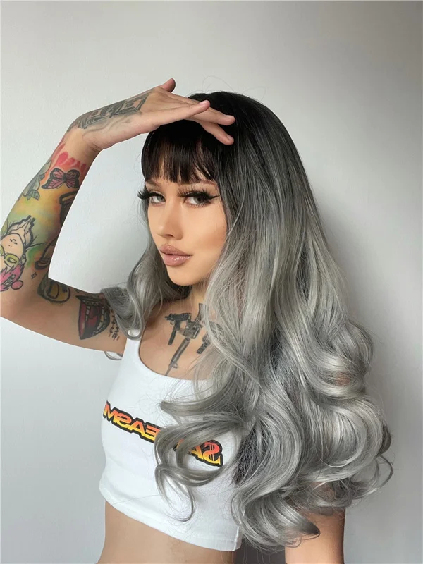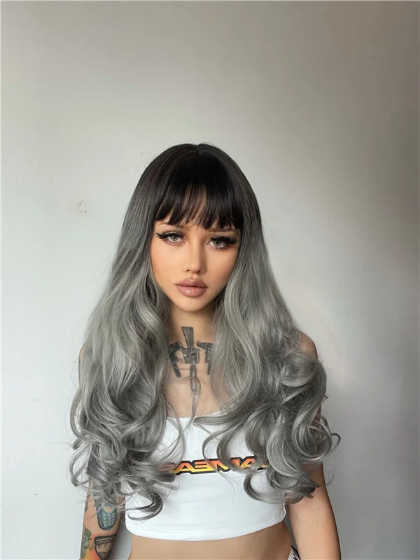 Длинные шелковистые прямые синтетические Омбре серые парики с челко...