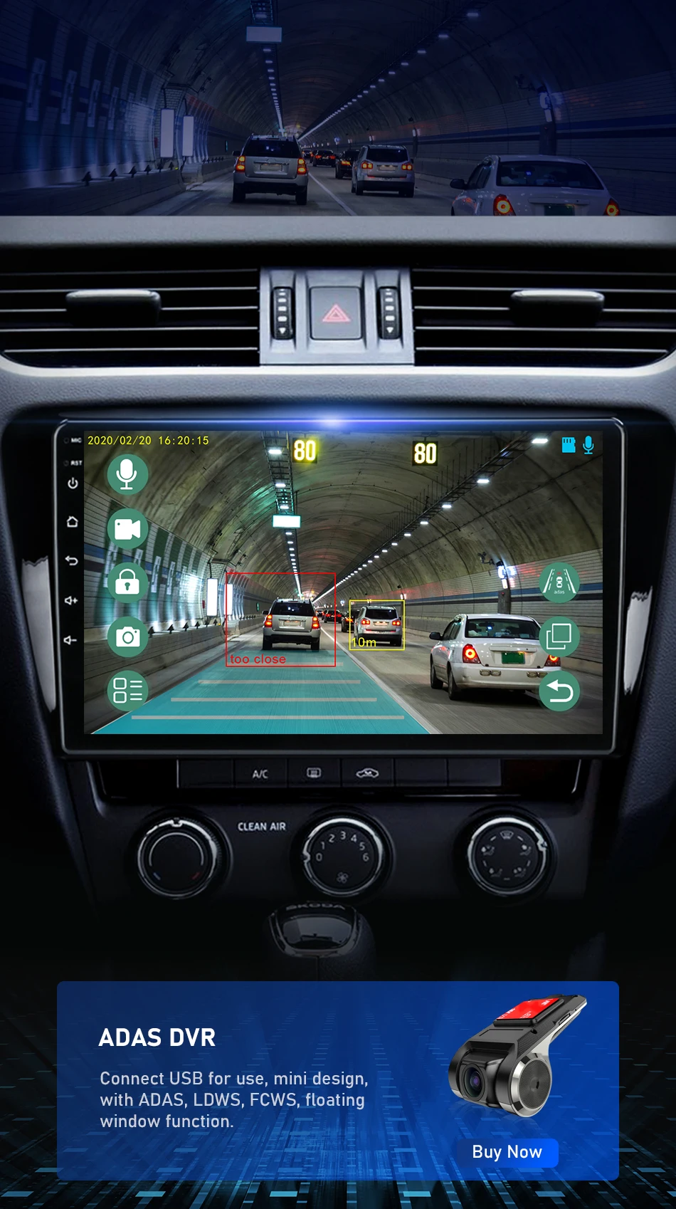 Поддерживает подключение к видеорегистраторУ ADAS. ADAS DVR имеет несколько встроенных ассистивных технологий вождения, вставляя высококачественную карту памяти TF для записи каждого момента вашего вождения.