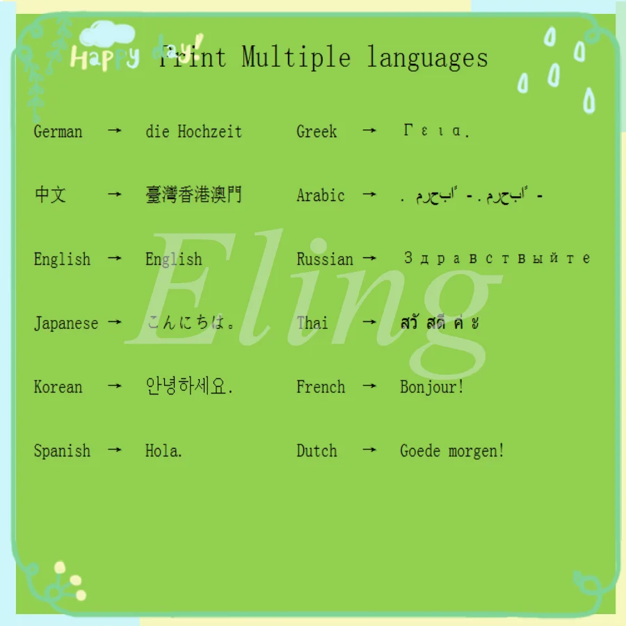 Китайский, английский, испанский, французский, арабский, русский, португальский, японский, корейский, тайский, голландский, немецкий и так далее.