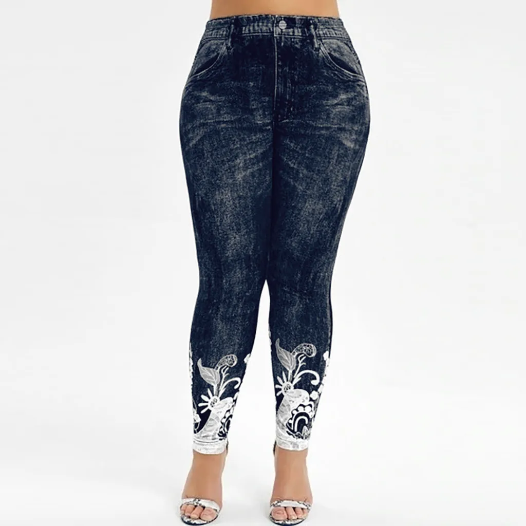 Женские леггинсы, имитация джинсов, цветочный принт, эластичная талия, брюки-карандаш, джеггинсы, джеггинсы, женские спортивные брюки, брюки