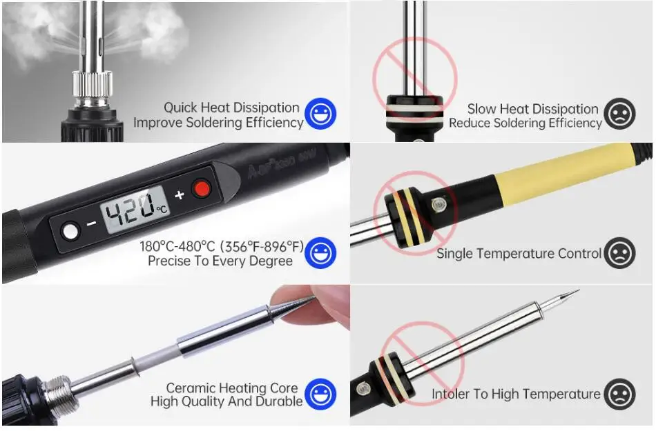 Этот паяльник является 80 Вт сварочным инструментом, который может работать в 180C -480C. Температура может быть скорректирована 1С. Он имеет штепсельную вилку ЕС и США на выбор.