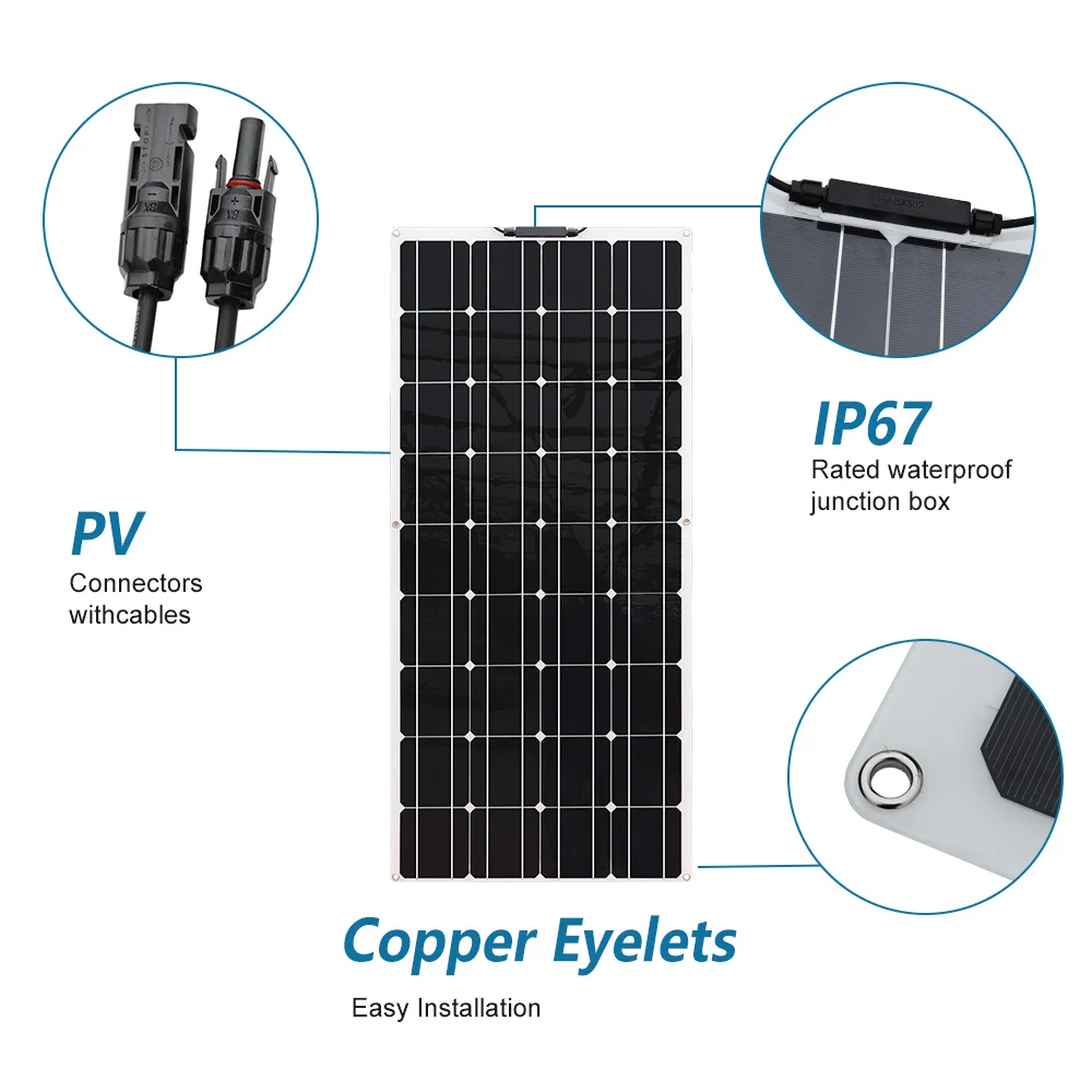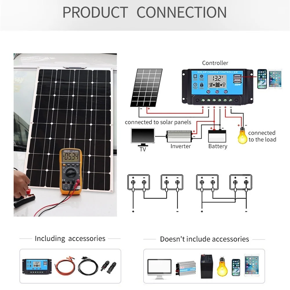 Солнечная панель 100 Вт, 1 шт.Контроллер заряда, 1 шт., 10 А, 12 В/24 В1 комплект удлинительного кабеля с PV разъемом1 комплект кабеля с зажимом типа «крокодил» (подключается к батарее)